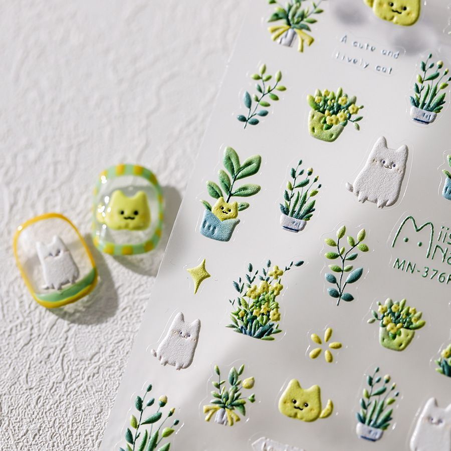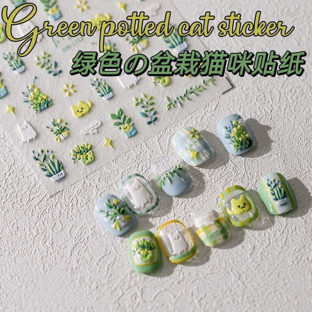 작은 신선한 화분에 심은 고양이 네일 아트 스티커 양각 일본 입체 만화 귀여운 접착 고양이 DIY 스티커