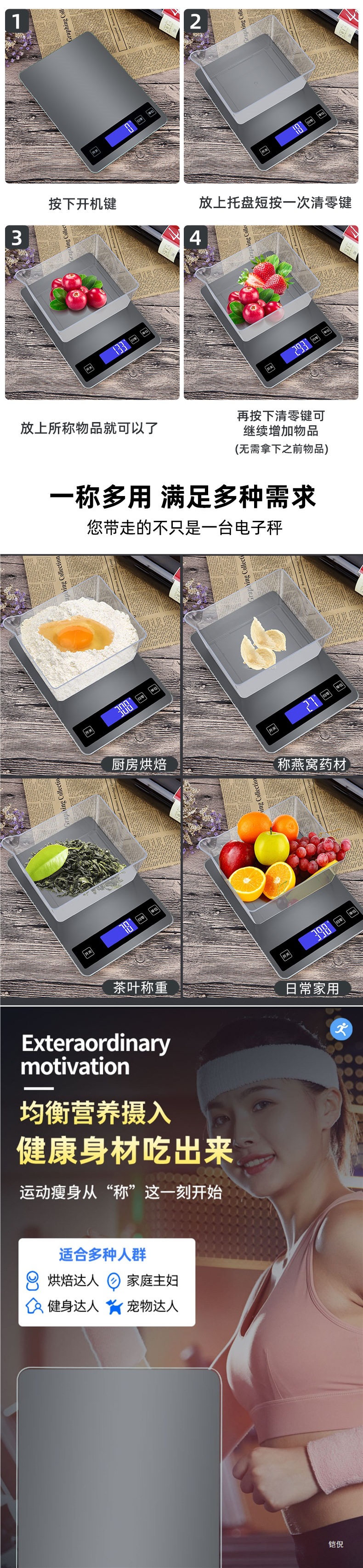 • 충전식 3회용 버전: 3kg/0.1g 무료: 계량컵 + 트레이 + 분동