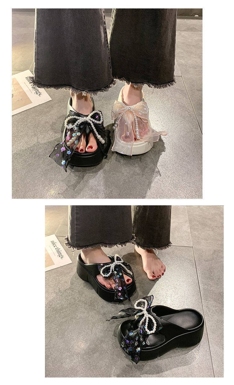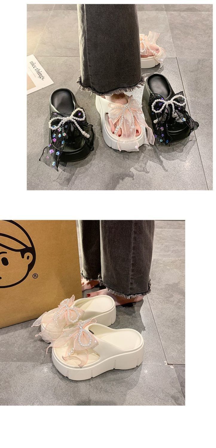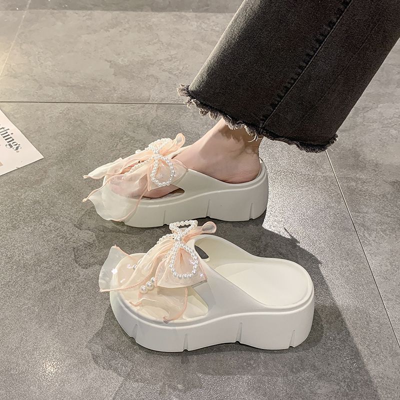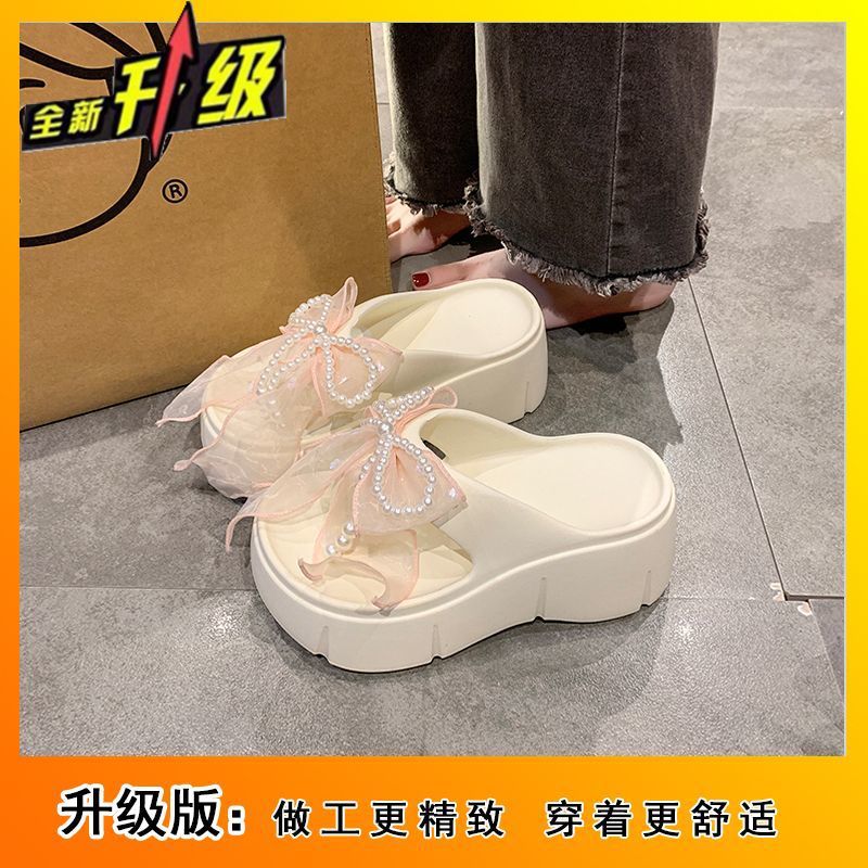 여름 아우터로 입기 좋은 여성을 위한 고급스럽고 귀여운 두꺼운 밑창 슬리퍼 2025 작은 사람들을 위한 가볍고 미끄럼 방지 기질의 리본 슬리퍼