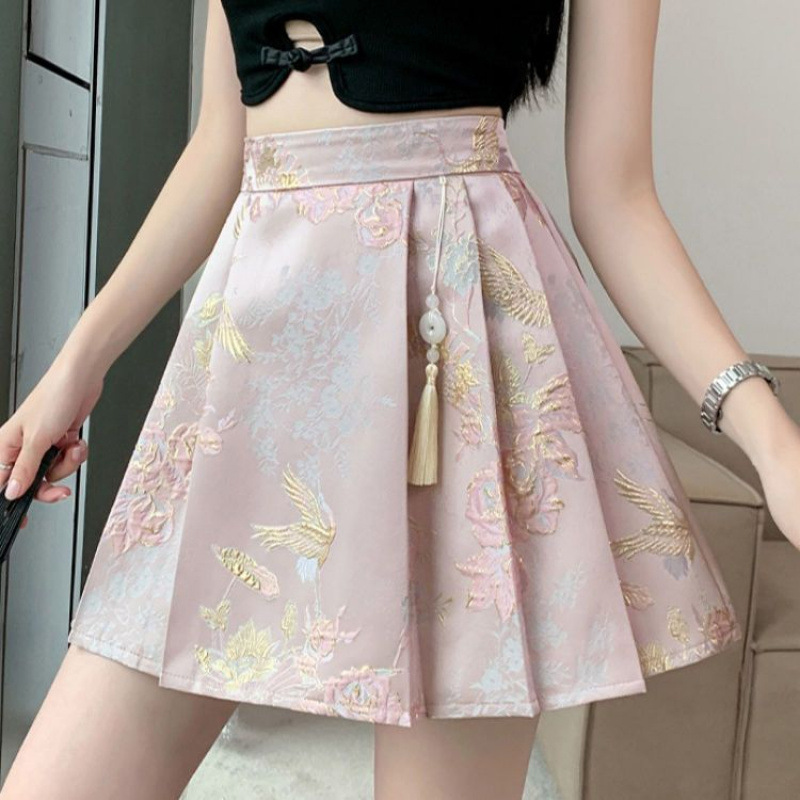 새로운 중국 스타일 국립 스타일 자카드 짧은 치마 핑크 아동 의류 높은 허리 치마 소녀 짧은 주름 치마 2025스토어 가기
