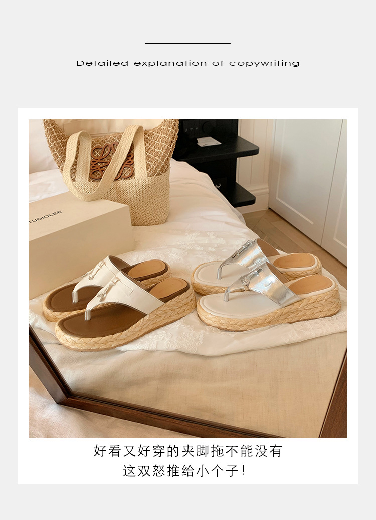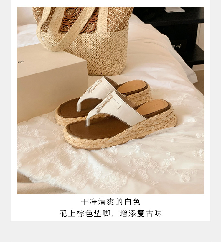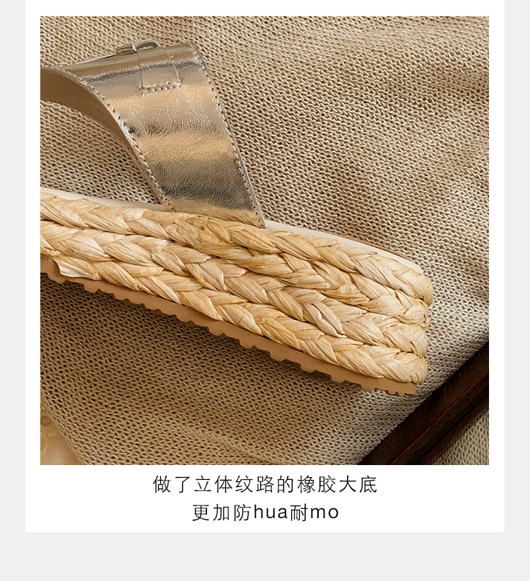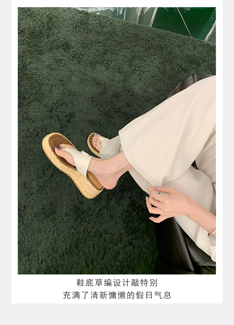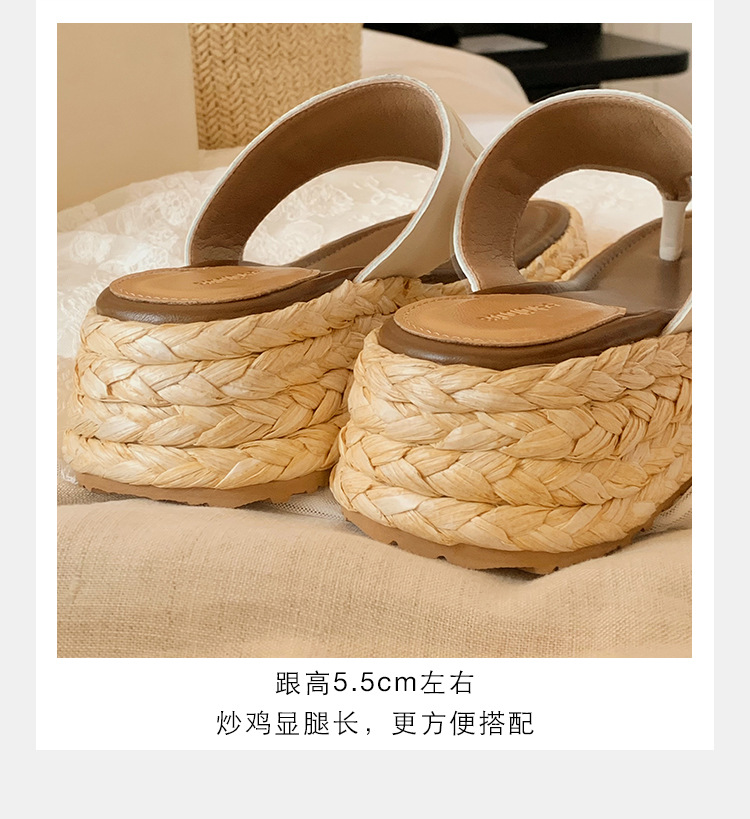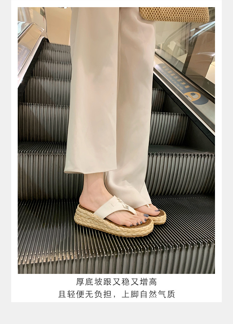 여름 아우터로 입기 좋은 여성용 스몰 슬리퍼, 키 5.5cm 증가~ 두꺼운 밑창 태슬 버클 슬리퍼, 헤링본 밀짚 샌들
