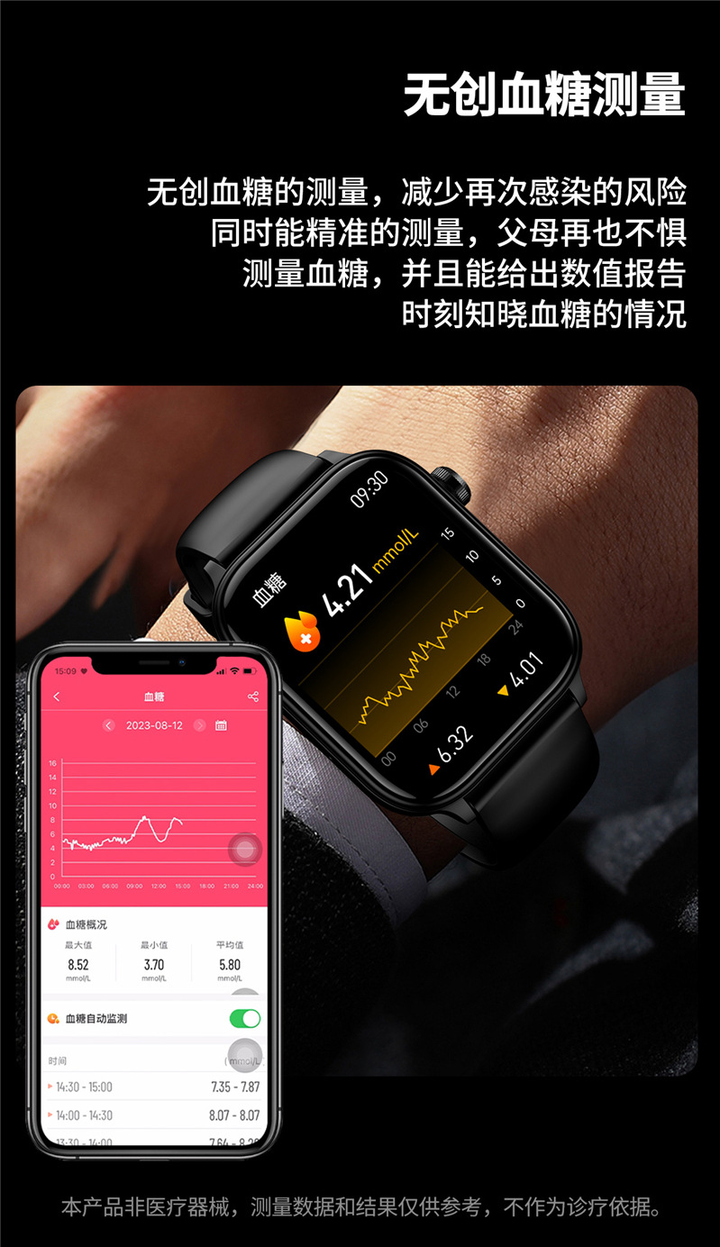 Function points | ECG ECG function, Bluetooth communication, noninvasive blood glucose measurement, blood component (uric acid and blood lipid) monitoring, body component (BMI body fat function) testing, intelligent micro-examination, HRV function, AI medical diagnosis, Metope function, body temperature monitoring, blood oxygen monitoring, respiratory training, emotion detection, fatigue detection, stress monitoring, women's health (menstrual tracking), heart rate monitoring, blood pressure monitoring, sleep. Step counting/calories/distance, multi-movement mode, music control,game, intelligent voice assistant, 1.39-inch HD 360*360 full-screen touch. APP: Hband |