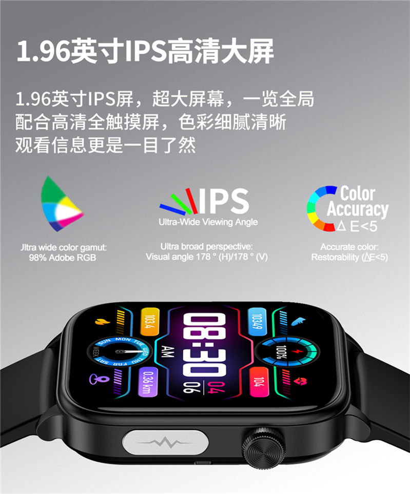 功能卖点 | ECG心电图功能,蓝牙通话,无创血糖测量,血液成分(尿酸血脂)监测,身体成分(BMI体脂功能)测试,智能微体检,HRV功能,AI医疗诊断,梅脱功能,体温监测,血氧监测,呼吸训练、情绪检测、疲劳度检测、压力监测,女性健康(经期跟踪),心率监测,血压监测,睡眠监测、久坐提醒等健康功能。 计步/卡路里/距离,多运动模式,音乐控制,游戏、智能语音助手,1.39英寸高清360*360全屏触摸。 APP: Hband |
