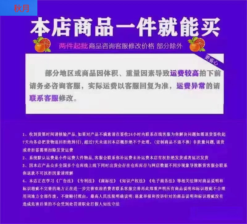 本店所有商品支持一件代发,商品混批,一件发货。放心购买,售后无忧。部分地区和单品价格低于10元的咨询客服运费及发货问题.否则由于运费问题的不予发货,运费异常的请联系客服修改。开票另加税点,可用对公账户付款,可开普票,增值税发票,公司票,个人票,收据,详细请咨询客服。收藏+加购物车=优先发货!