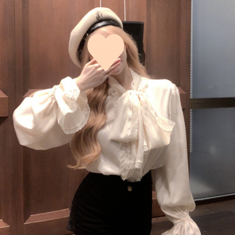 프렌치 벨 슬리브 셔츠, 여성스러운 리본 레이스 스플라이싱 긴팔 탑, 이너웨어 쉬폰 셔츠스토어 가기