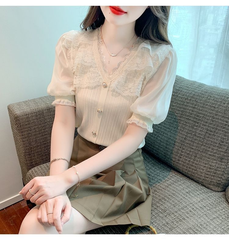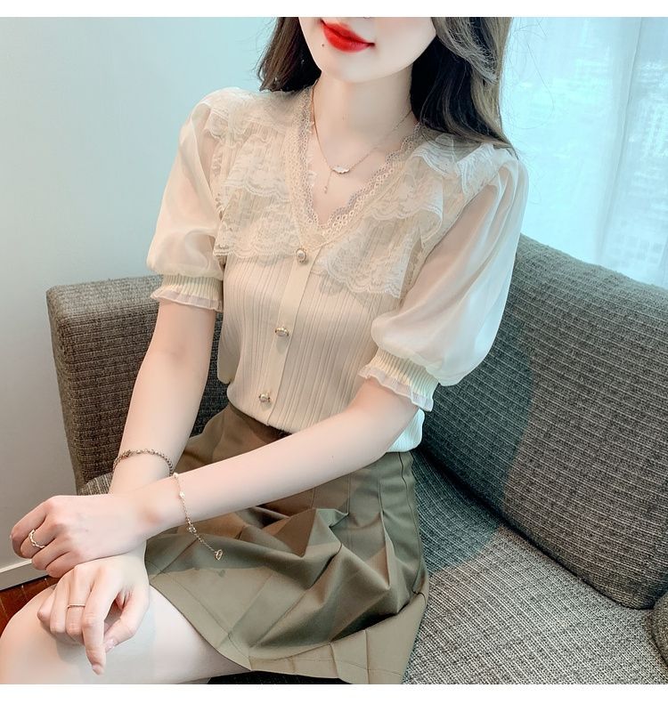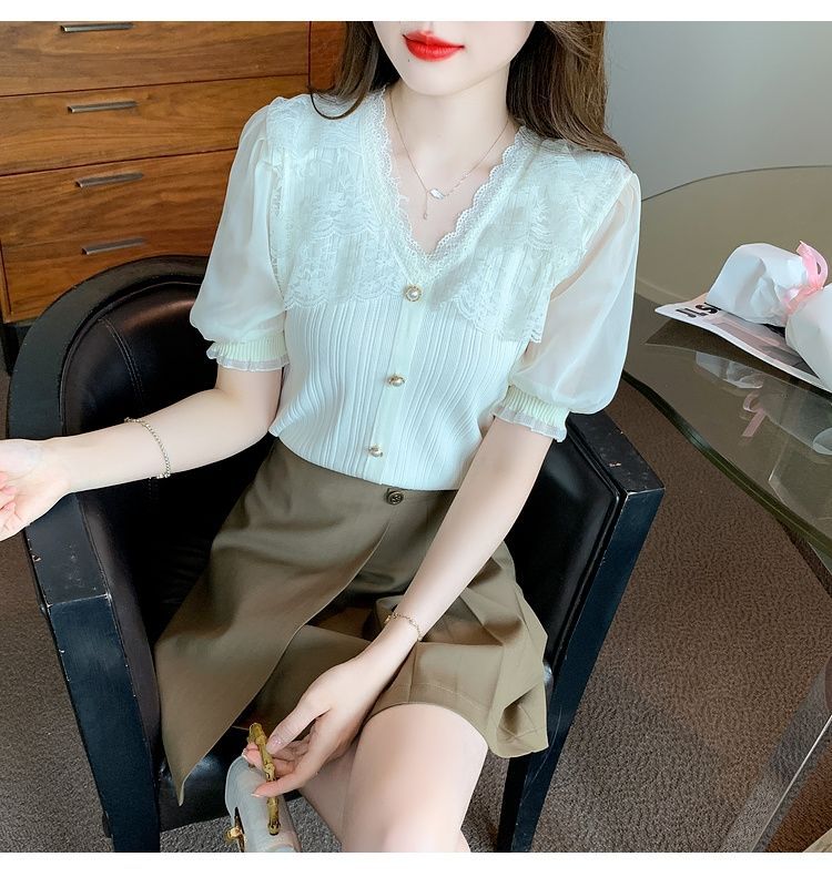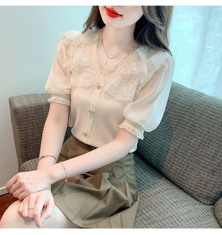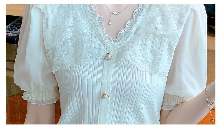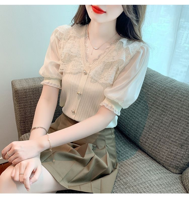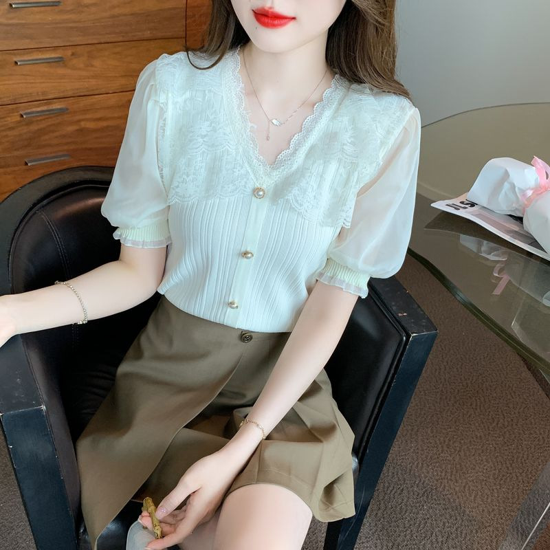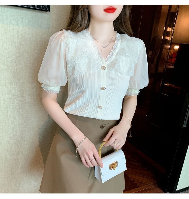 여름 착용 2025 새로운 스타일 레이스 v 넥 반팔 스웨터 여성 슬리밍 쉬폰 퍼프 슬리브 탑