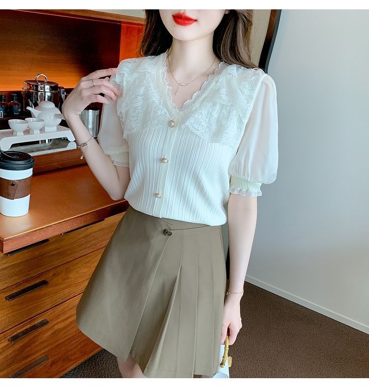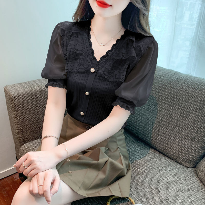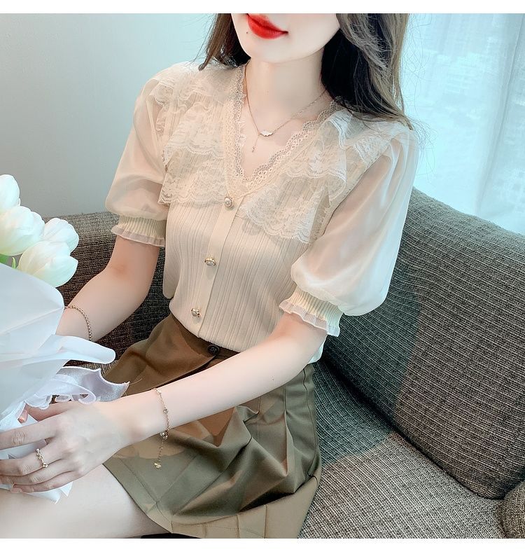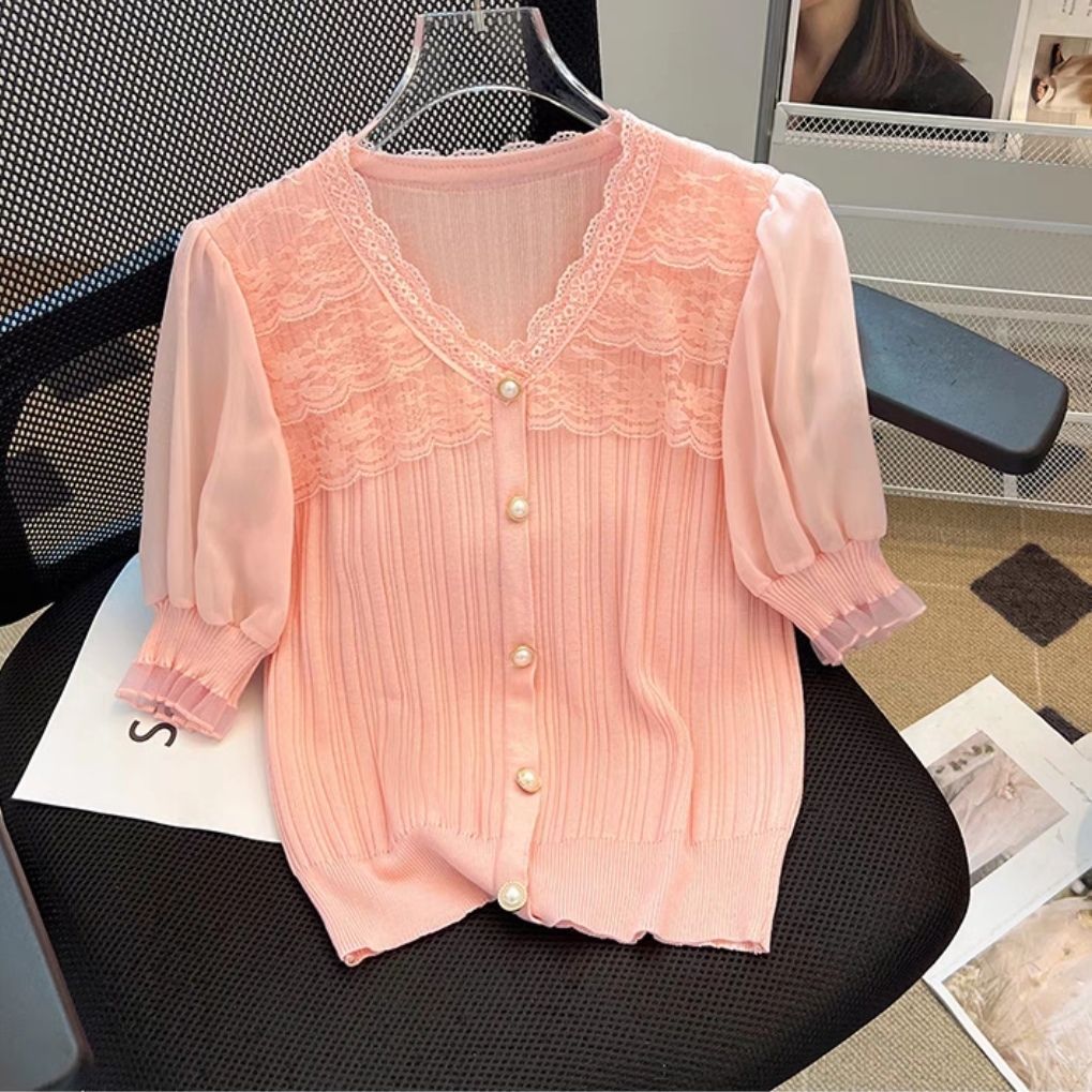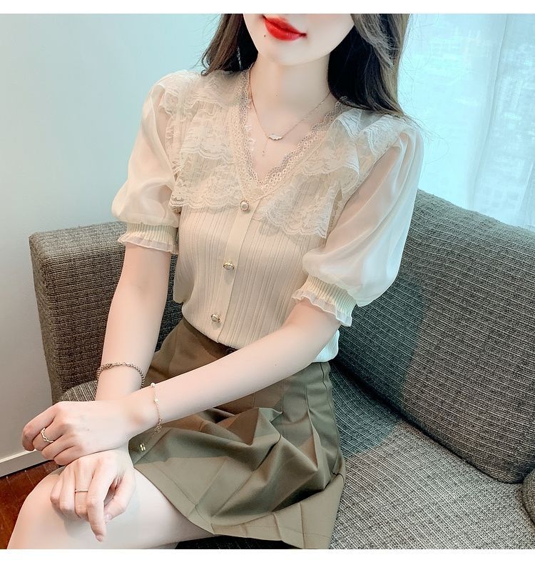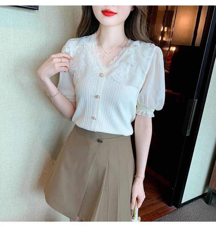 여름 착용 2025 새로운 스타일 레이스 v 넥 반팔 스웨터 여성 슬리밍 쉬폰 퍼프 슬리브 탑