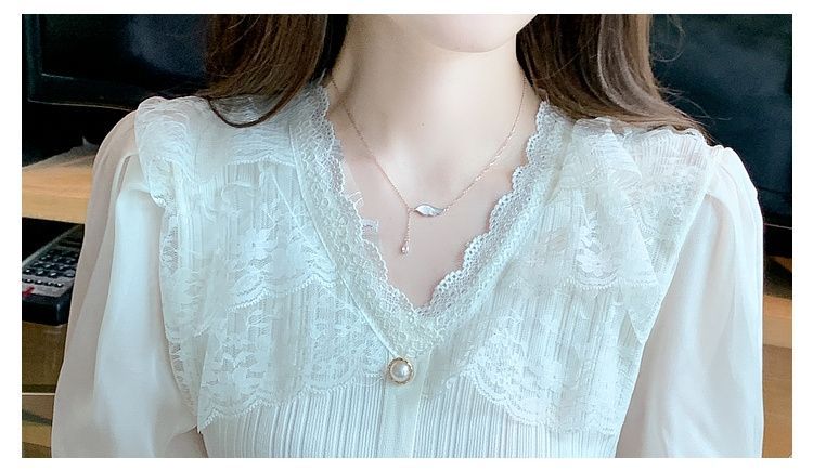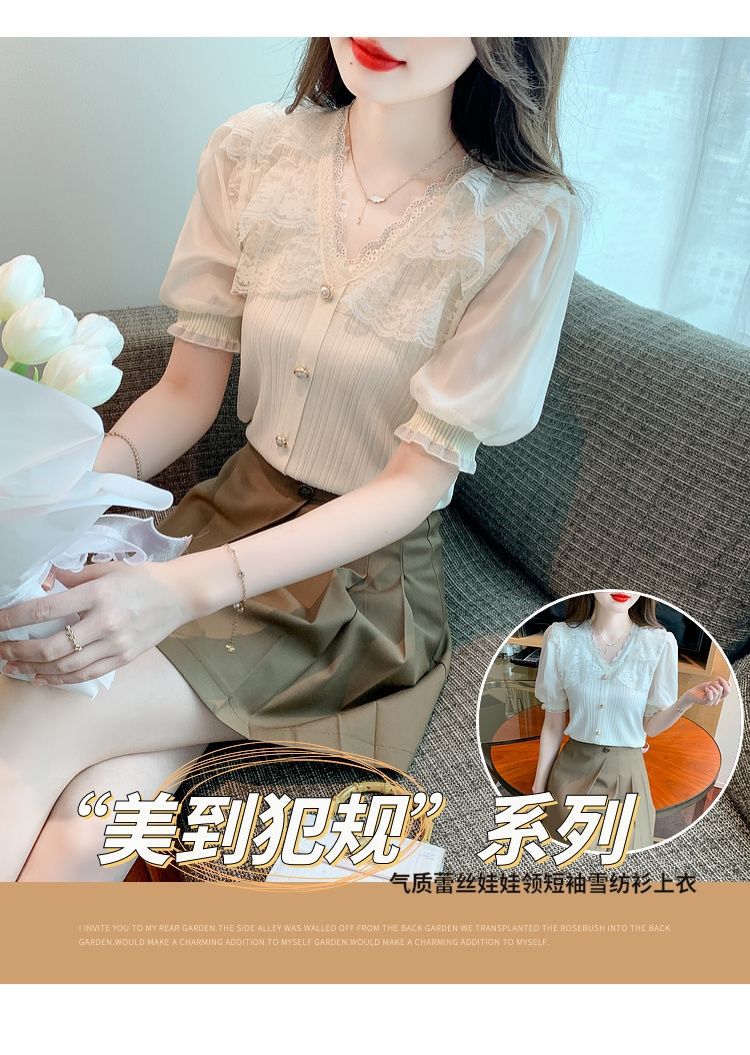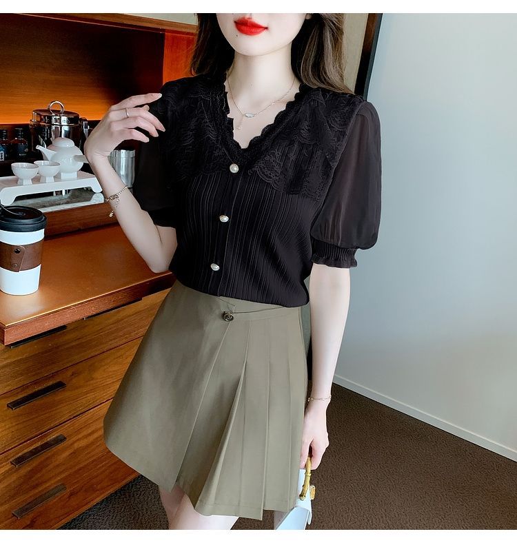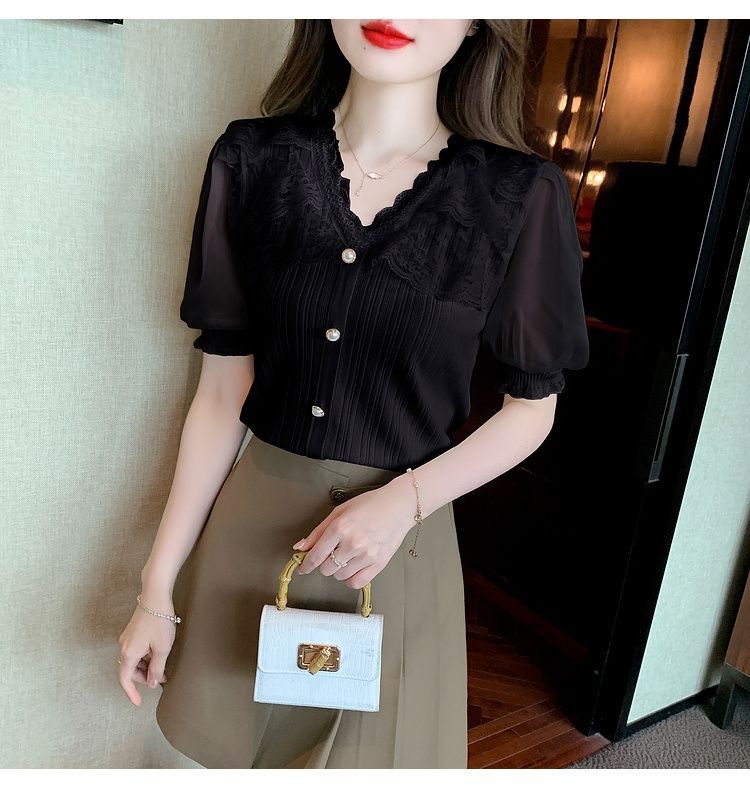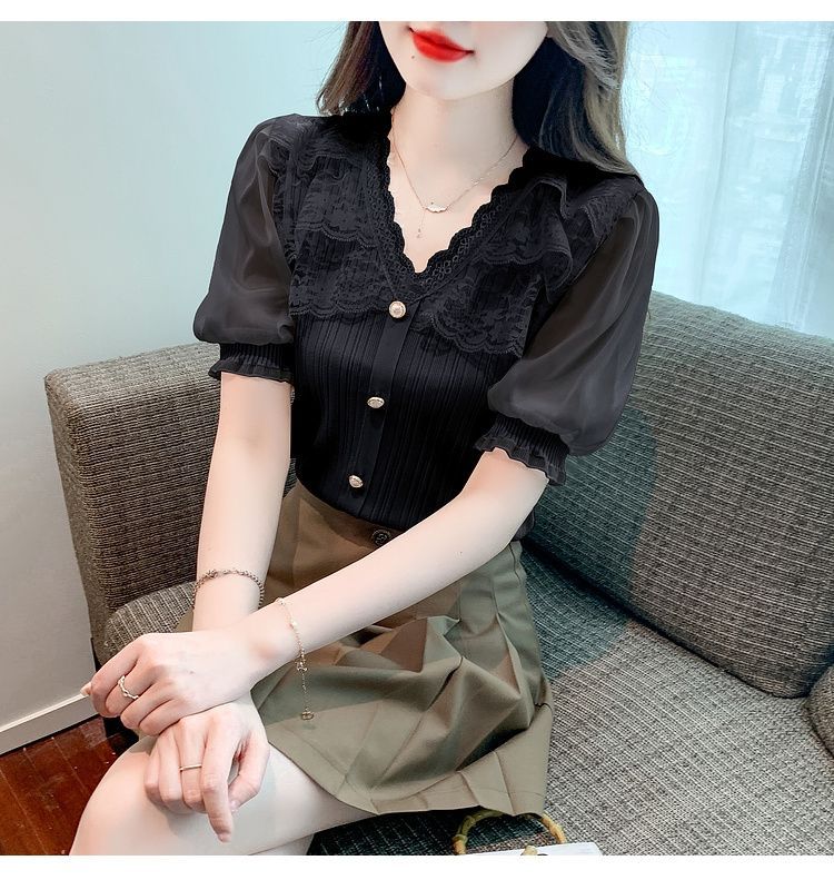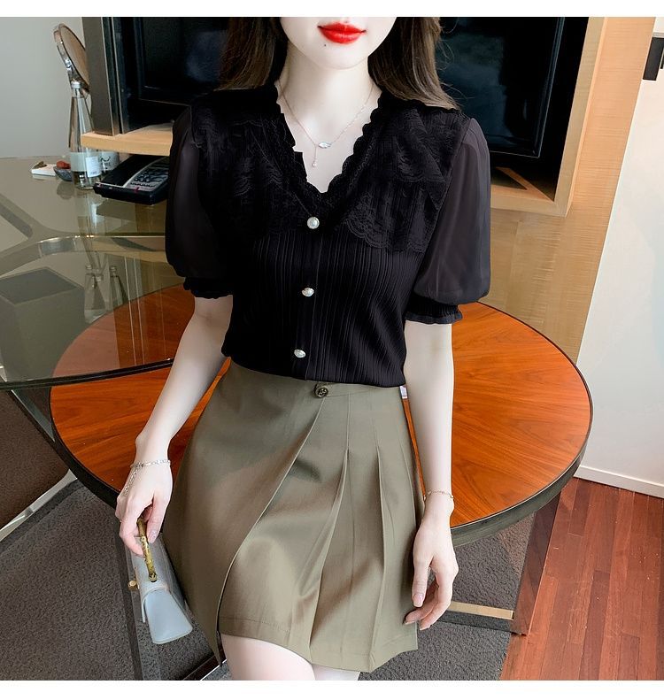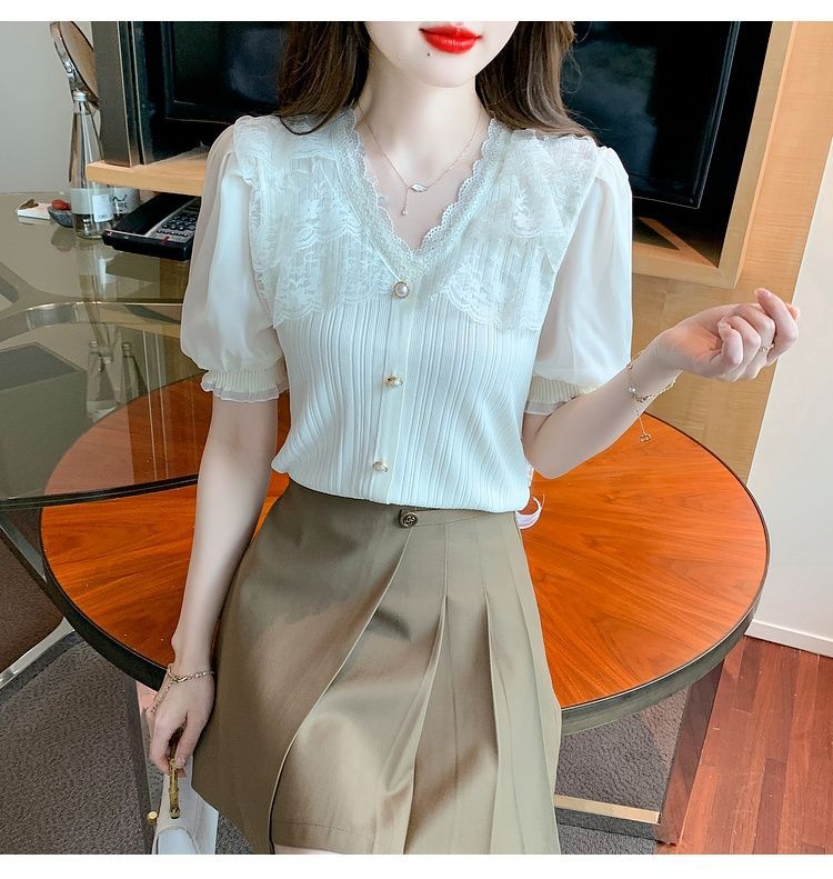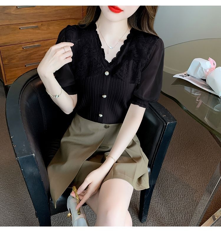 여름 착용 2025 새로운 스타일 레이스 v 넥 반팔 스웨터 여성 슬리밍 쉬폰 퍼프 슬리브 탑