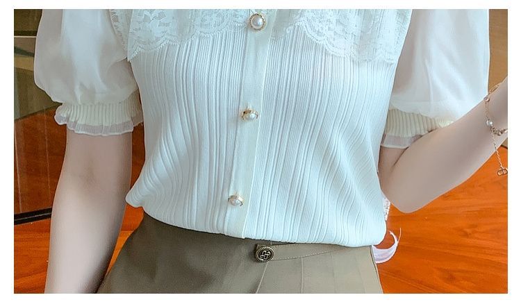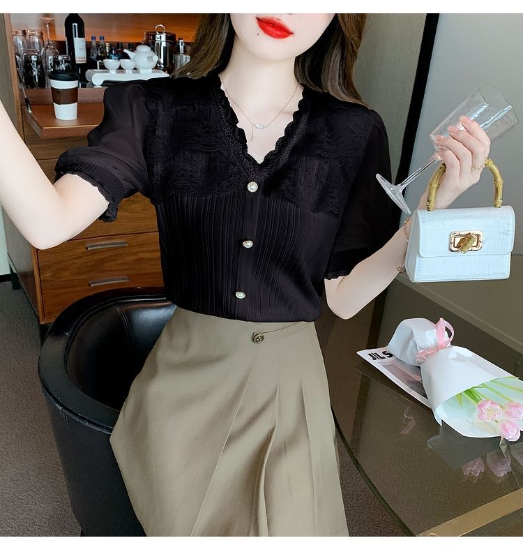 여름 착용 2025 새로운 스타일 레이스 v 넥 반팔 스웨터 여성 슬리밍 쉬폰 퍼프 슬리브 탑스토어 가기