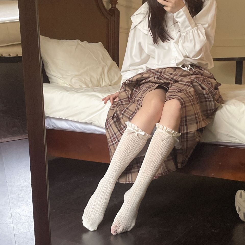 레이스 로리타 통기성 종아리 양말 봄 여름 일본식 달콤한 흰색 jk 양말 나비 매듭 종아리 양말