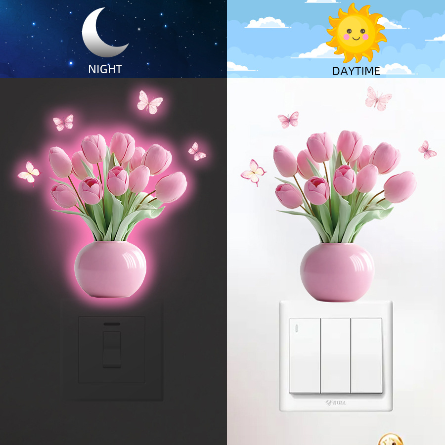 HS-YG100C 핑크 튤립 화분에 심은 식물 자체 접착 발광 벽 스티커 어린이 방 홈 장식 스티커스토어 가기