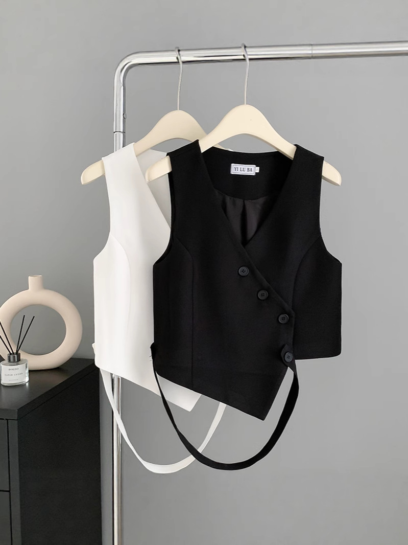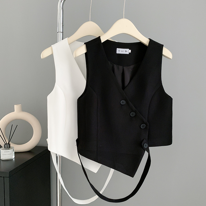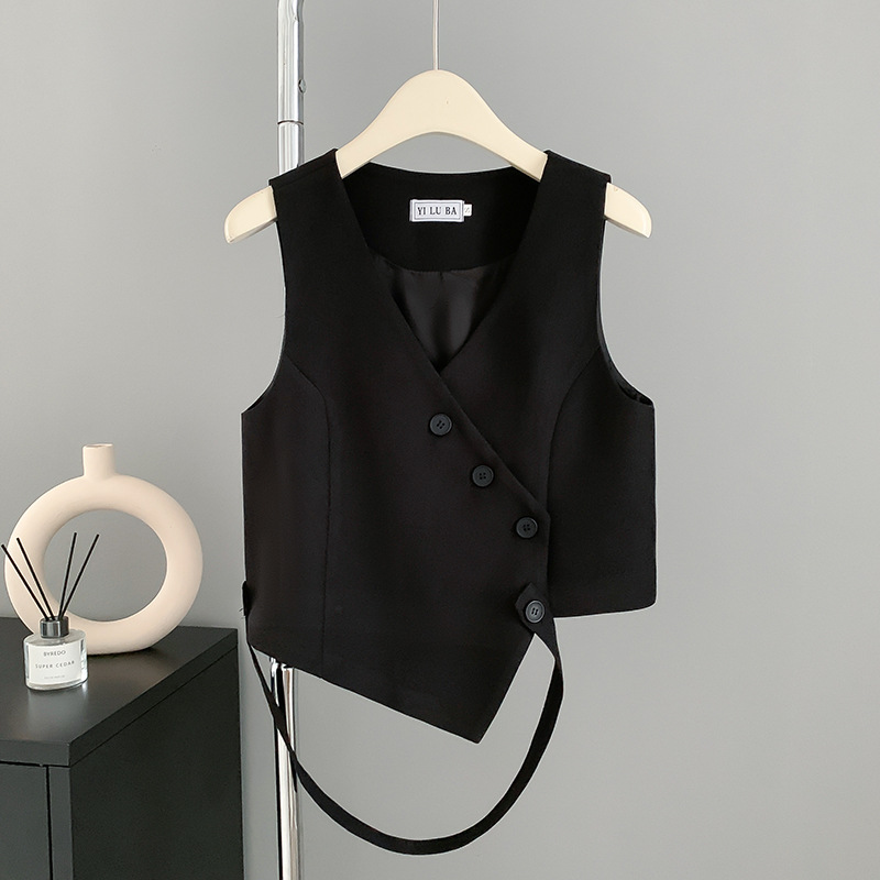 여름 아우터로 입기 좋은 여성용 디자인 쇼트 니치 블랙 수트 조끼, V넥 슬리밍 레이어드 탑스토어 가기