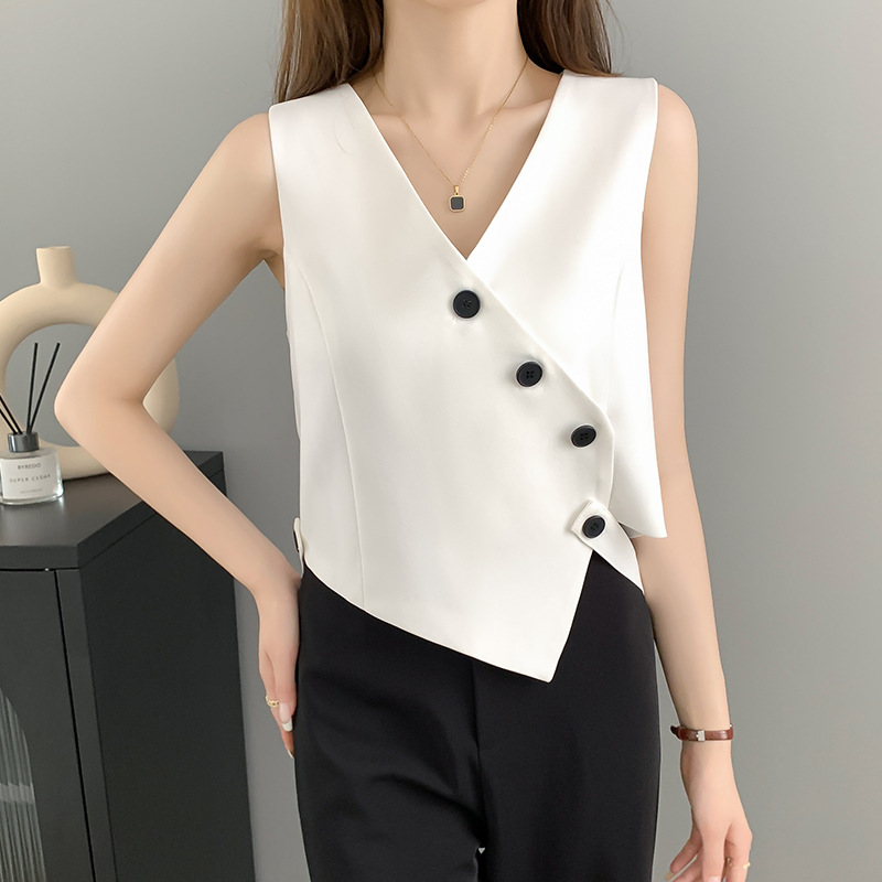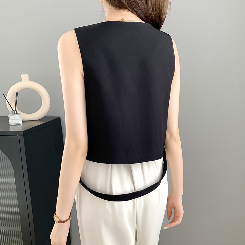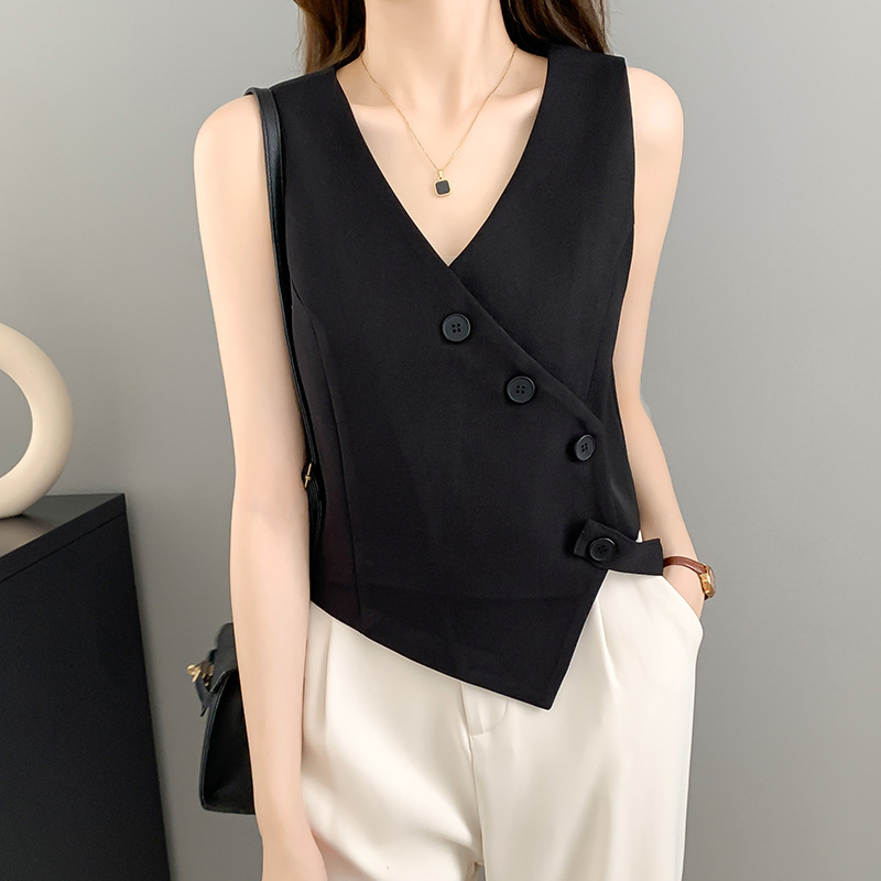 여름 아우터로 입기 좋은 여성용 디자인 쇼트 니치 블랙 수트 조끼, V넥 슬리밍 레이어드 탑