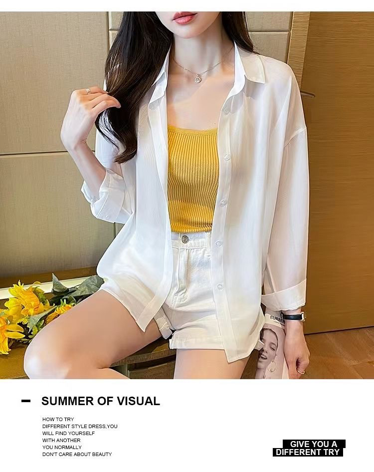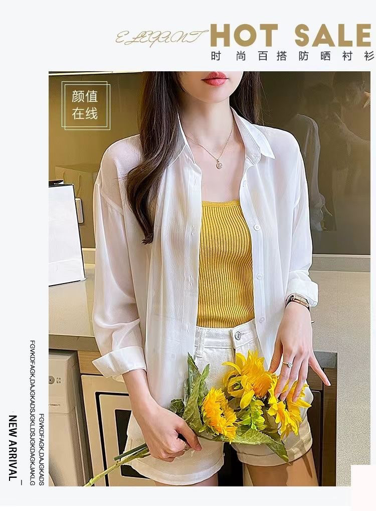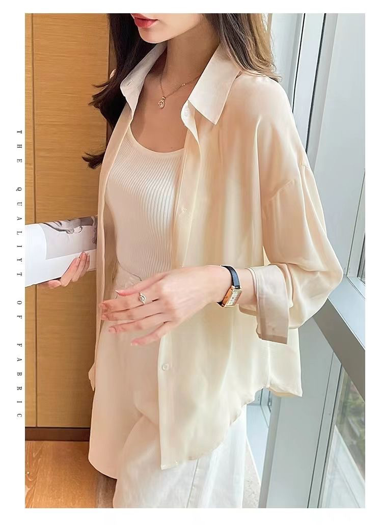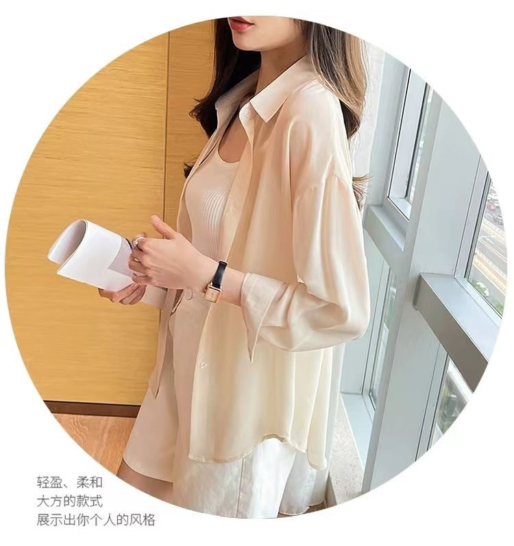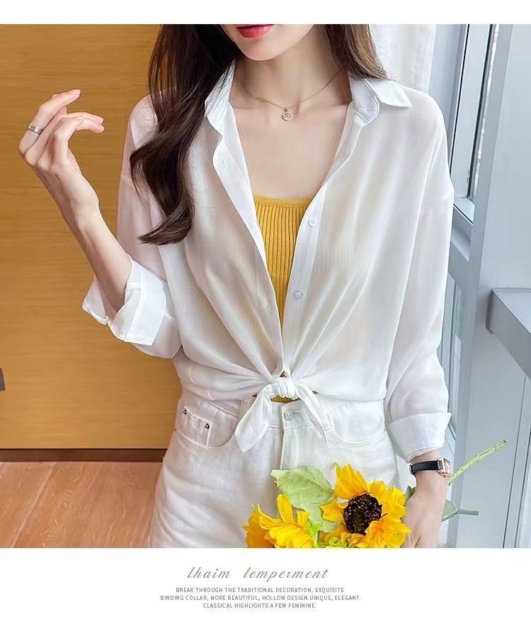 여성을위한 화이트 아이스 실크 자외선 차단제 코트 2025 여름 약간 반투명 셔츠 작은 긴팔 카디건 쉬폰 셔츠