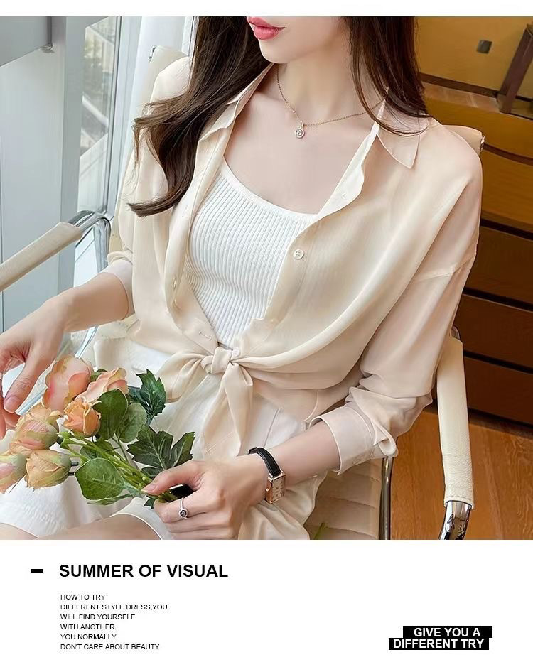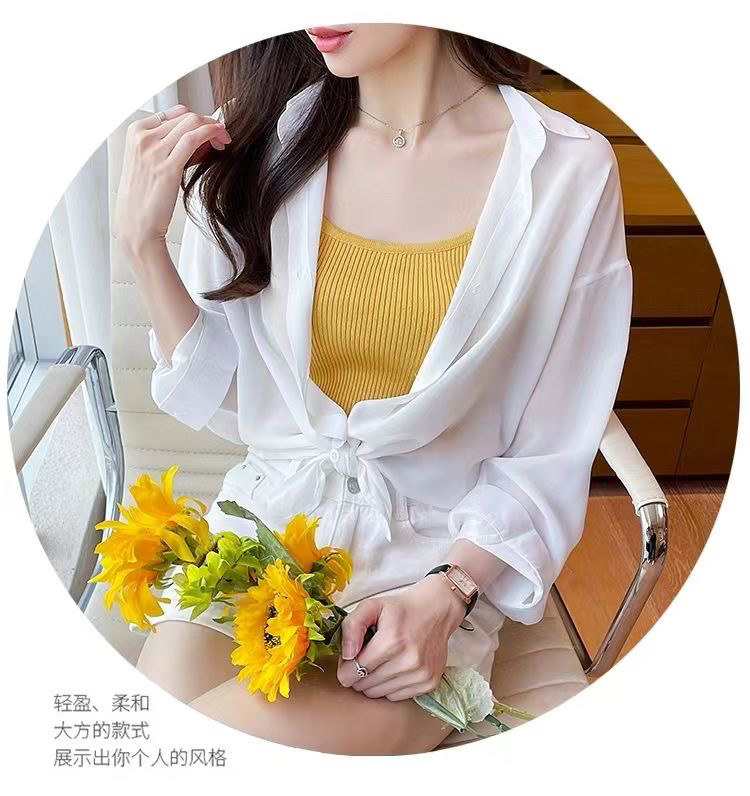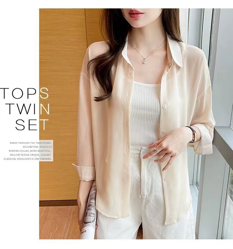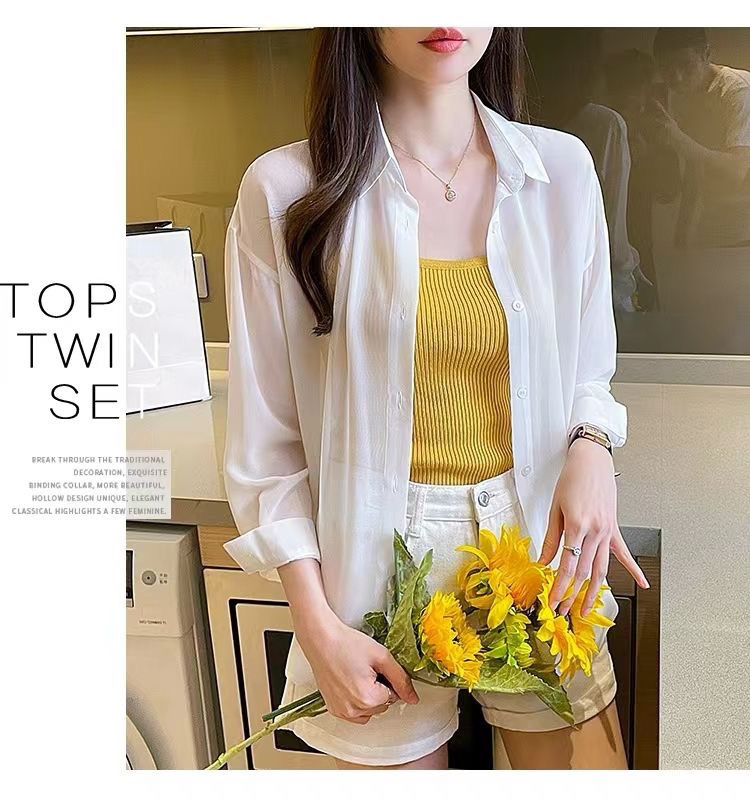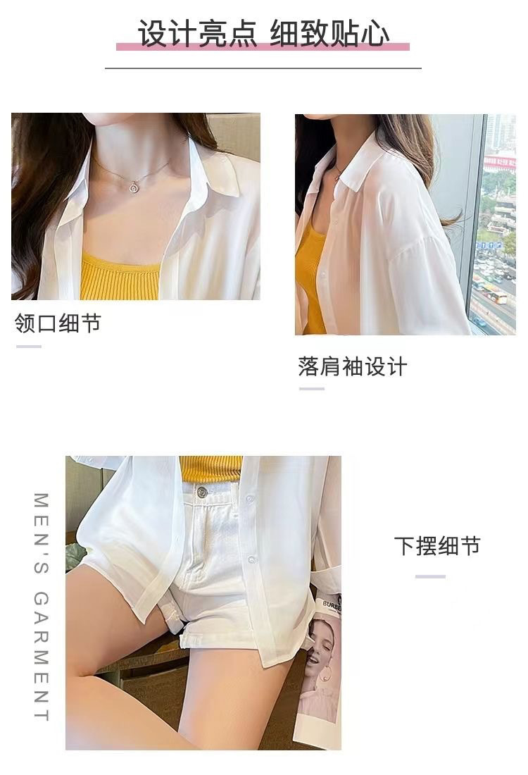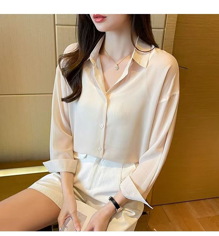 여성을위한 화이트 아이스 실크 자외선 차단제 코트 2025 여름 약간 반투명 셔츠 작은 긴팔 카디건 쉬폰 셔츠
