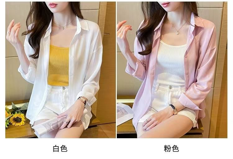 여성을위한 화이트 아이스 실크 자외선 차단제 코트 2025 여름 약간 반투명 셔츠 작은 긴팔 카디건 쉬폰 셔츠스토어 가기