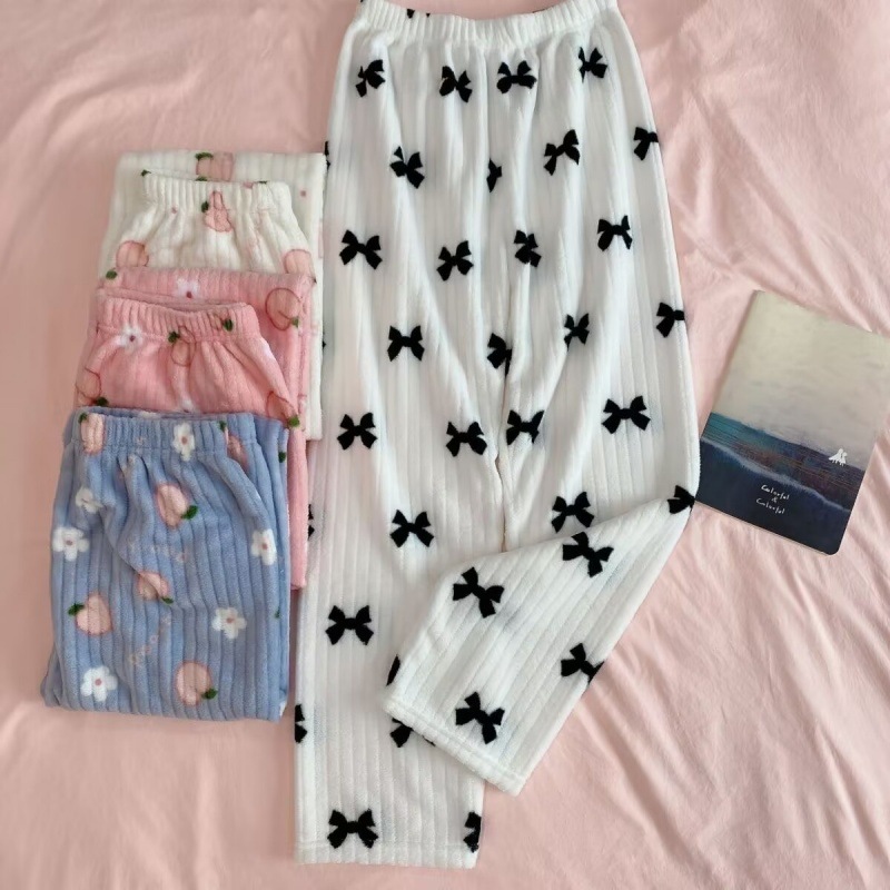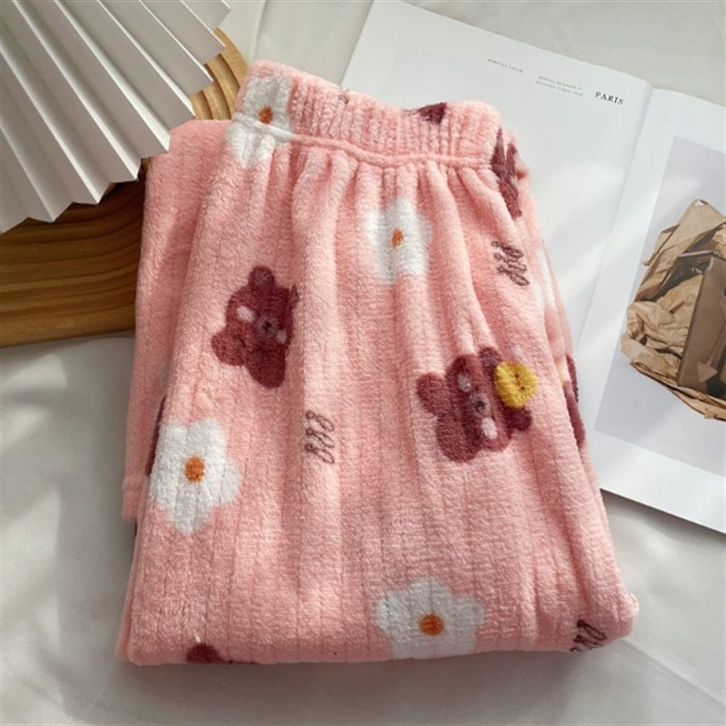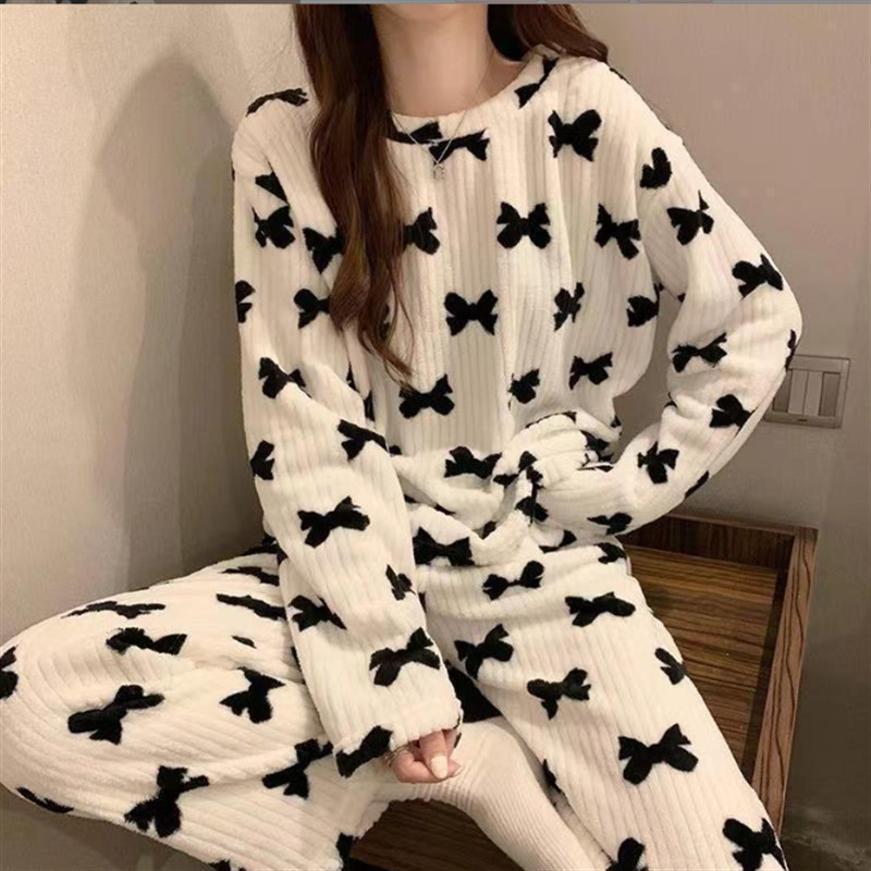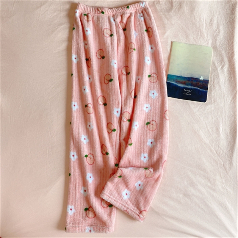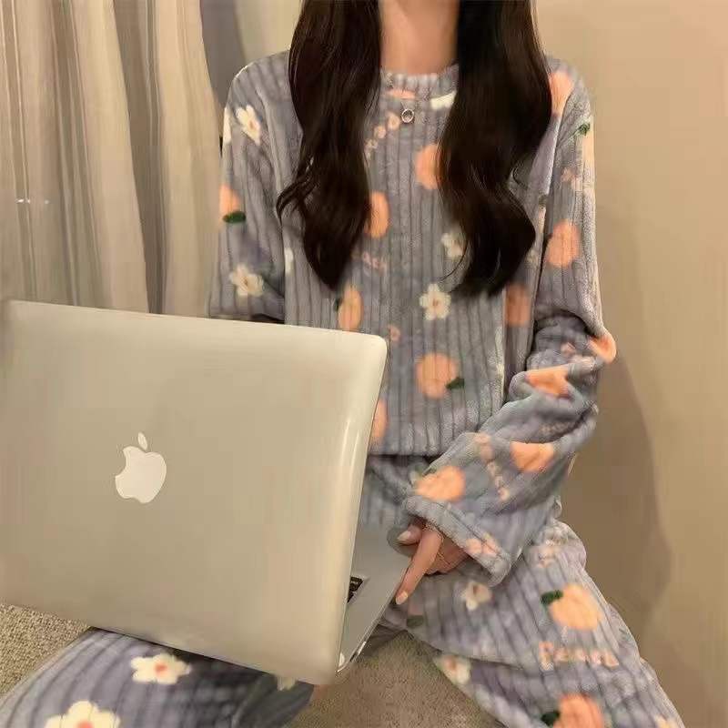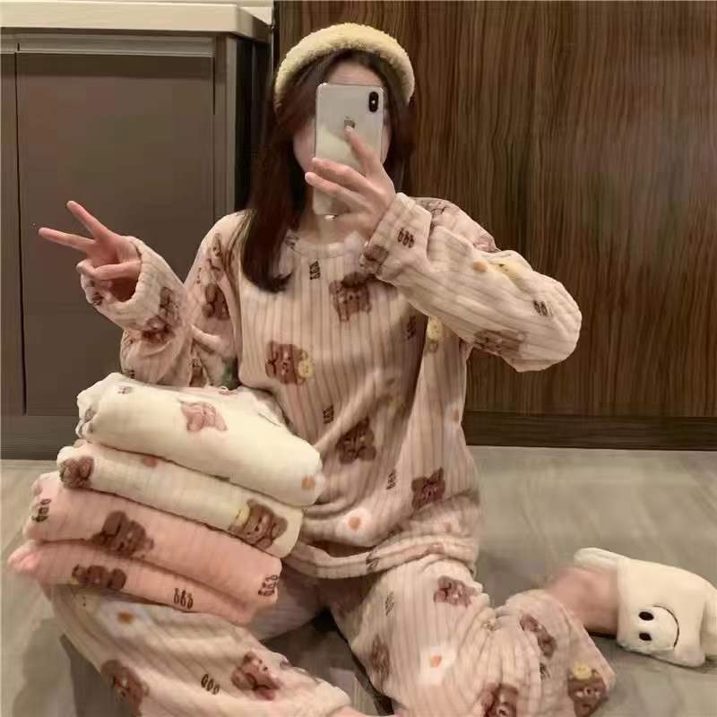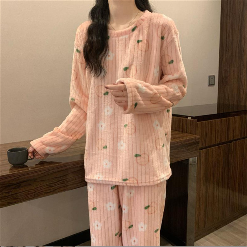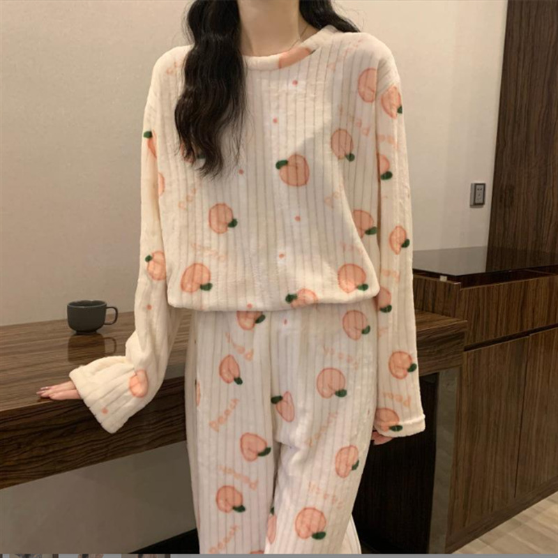 여성을위한 두꺼운 복숭아 따뜻한 세트 2025 가을, 겨울 만화 달콤한 산호 벨벳 잠옷 파자마 바지 라운드 넥 홈