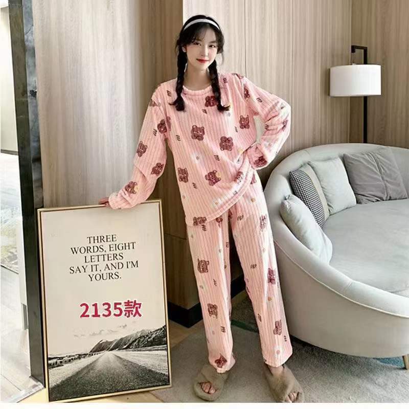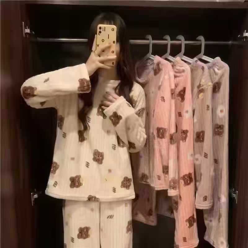 여성을위한 두꺼운 복숭아 따뜻한 세트 2025 가을, 겨울 만화 달콤한 산호 벨벳 잠옷 파자마 바지 라운드 넥 홈스토어 가기