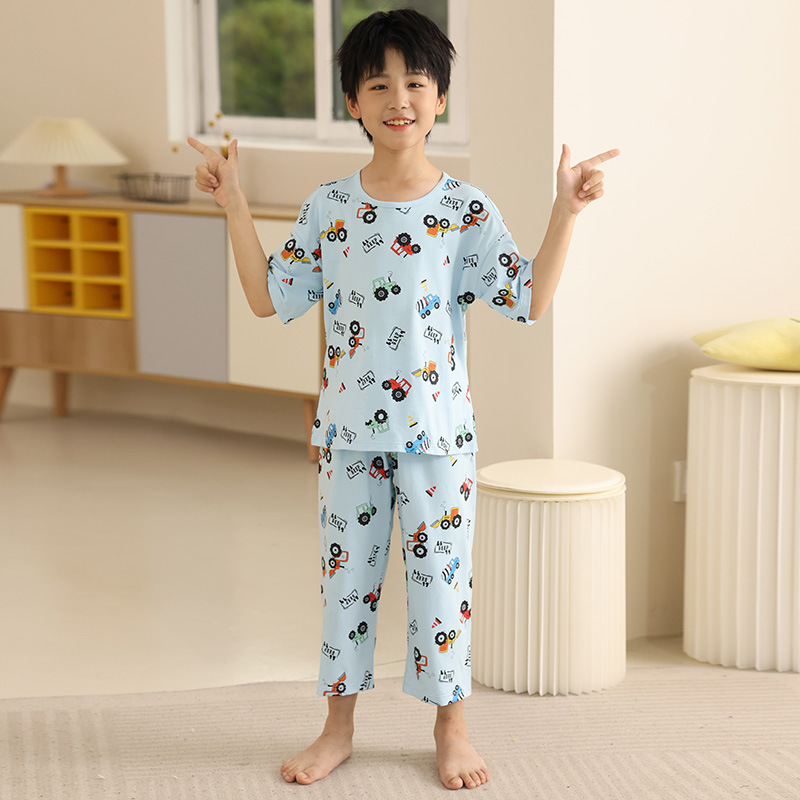 어린이 잠옷 세트 여름 얇은 순수 면화 만화 반팔 크롭 바지 에어컨 옷 소년과 소녀 가정 의류 여름