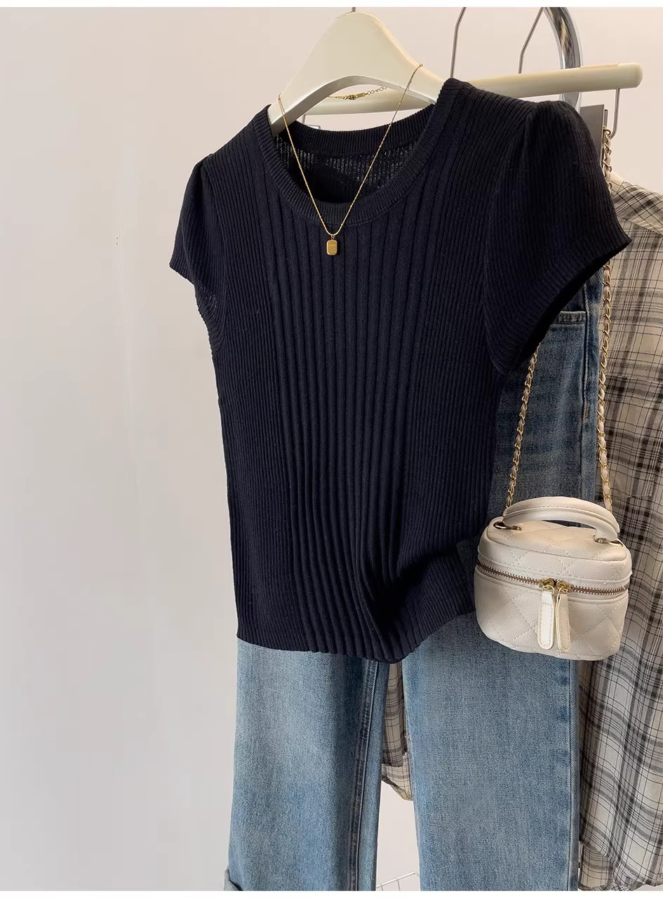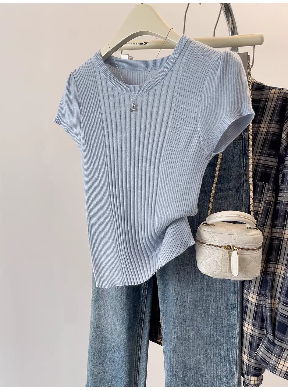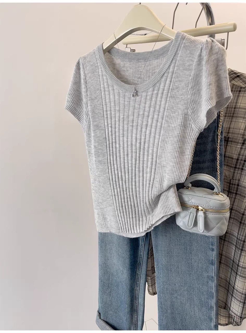여름용 얇은 아이스 실크 니트 반팔 티셔츠 여성용 2026 고급 슬림핏 우아한 어깨라인 티셔츠 A4304