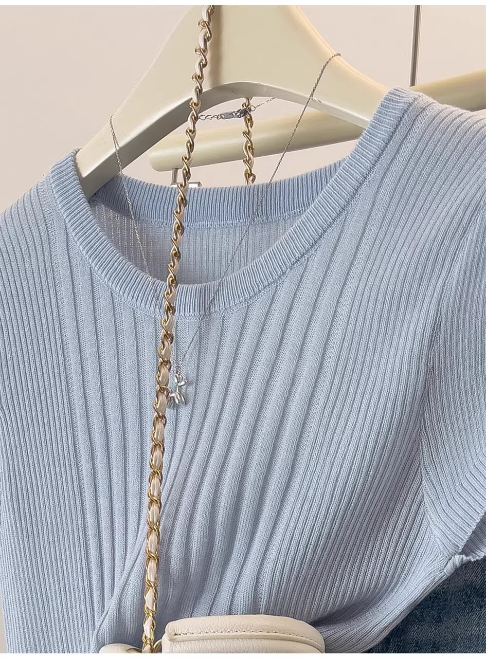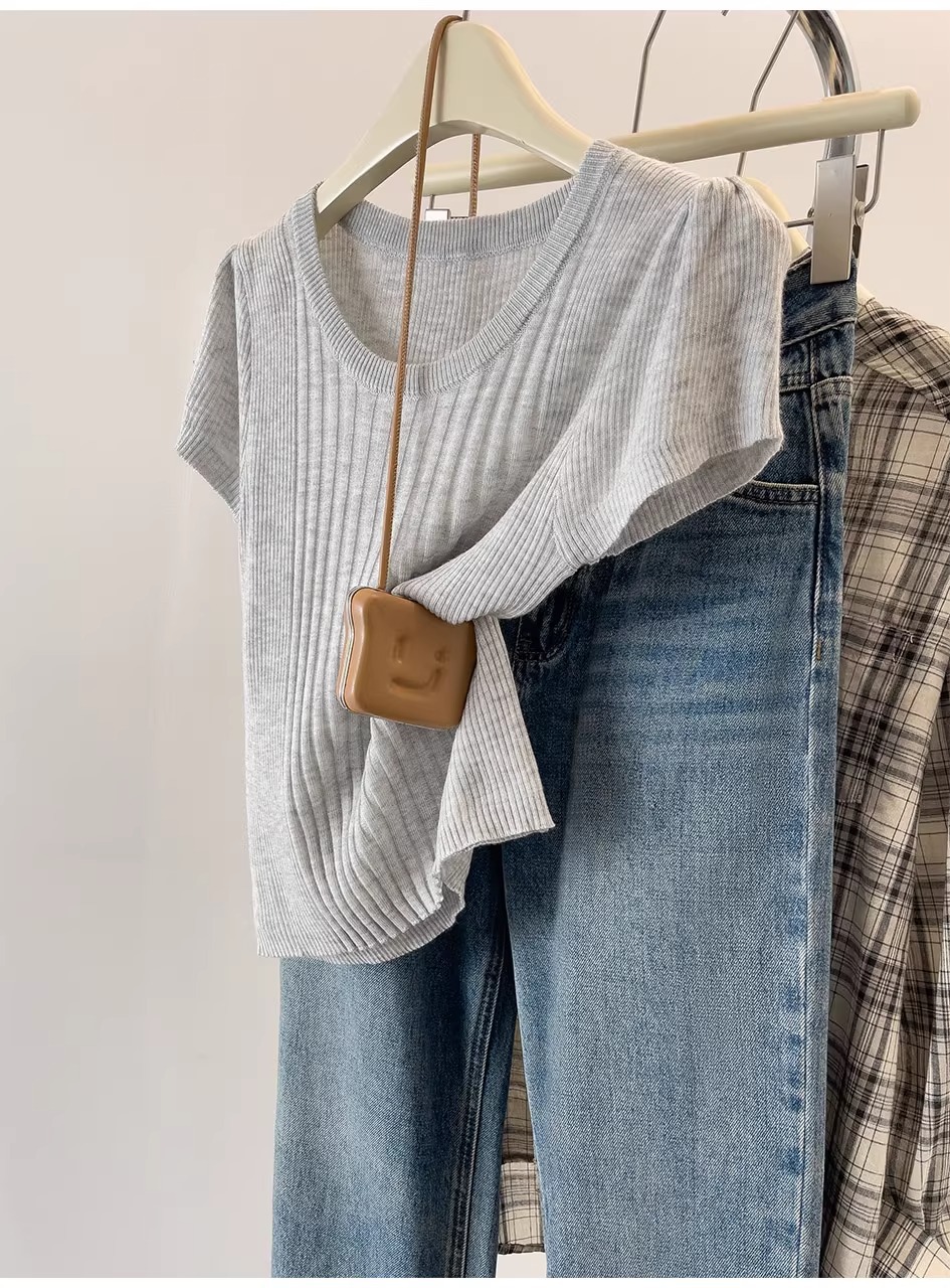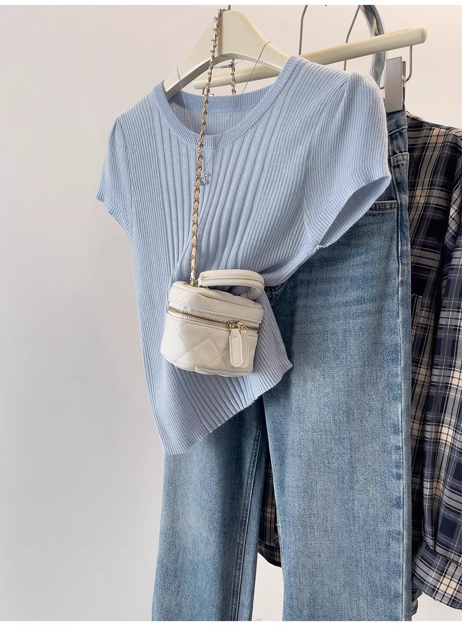 여름용 얇은 아이스 실크 니트 반팔 티셔츠 여성용 2026 고급 슬림핏 우아한 어깨라인 티셔츠 A4304