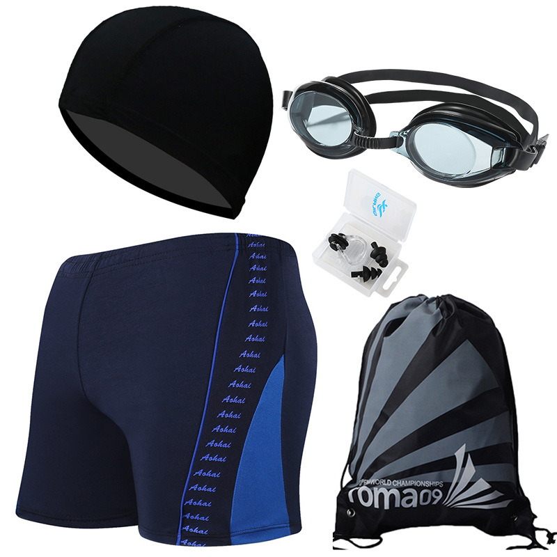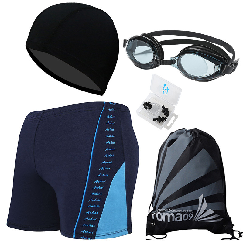 • 블루 하단 레이크 블루 (수영 트렁크 + 수영 모자 + 코 클립 귀마개 + 수영 고글 + 비치 백)
