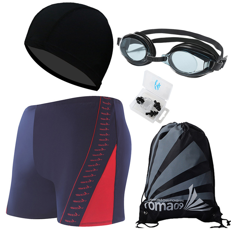 • 파란색 바탕에 빨간색 (수영 트렁크 + 수영 모자 + 코 클립 귀마개 + 수영 고글 + 비치 백)