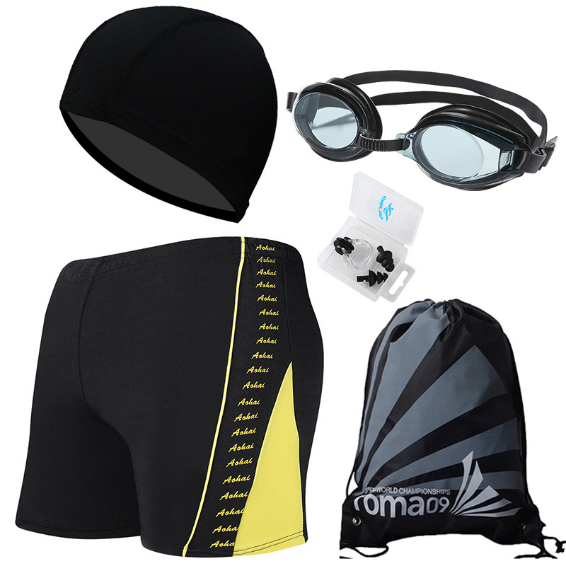 • 검정색 바탕에 노란색 (수영 트렁크 + 수영 모자 + 코 클립 귀마개 + 수영 고글 + 비치 백)