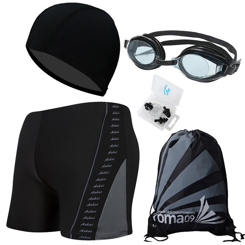 • 검정색 바탕에 회색 (수영 트렁크 + 수영 모자 + 코 클립 귀마개 + 수영 고글 + 비치 백)