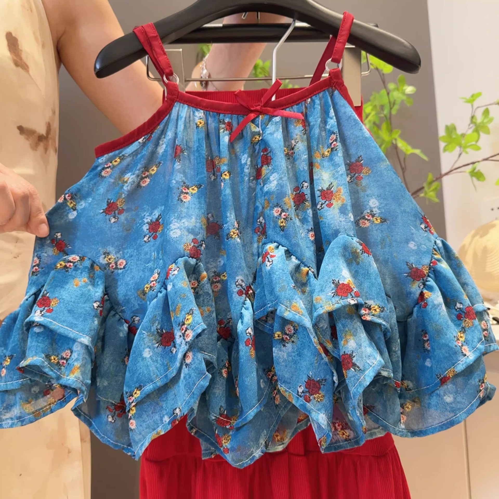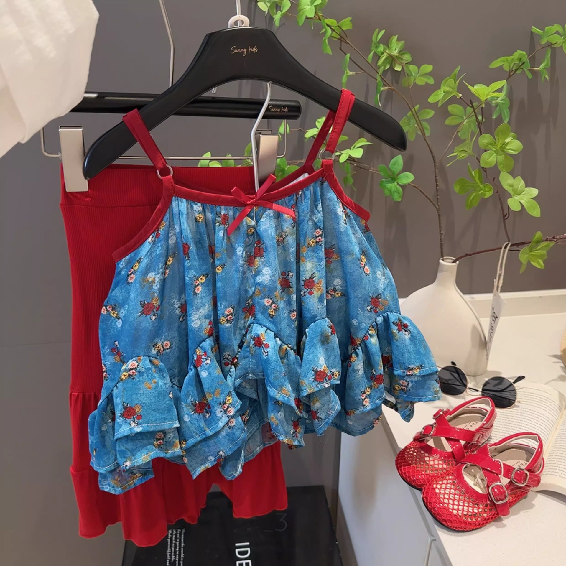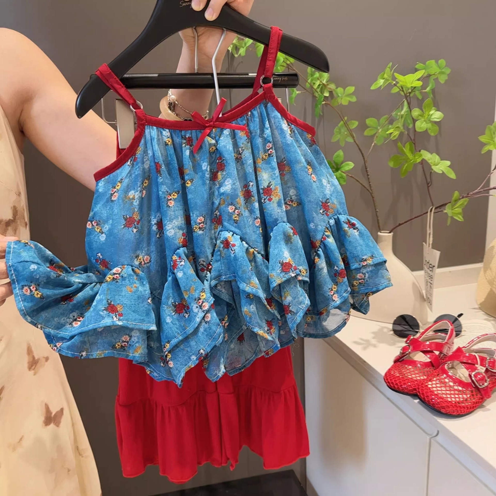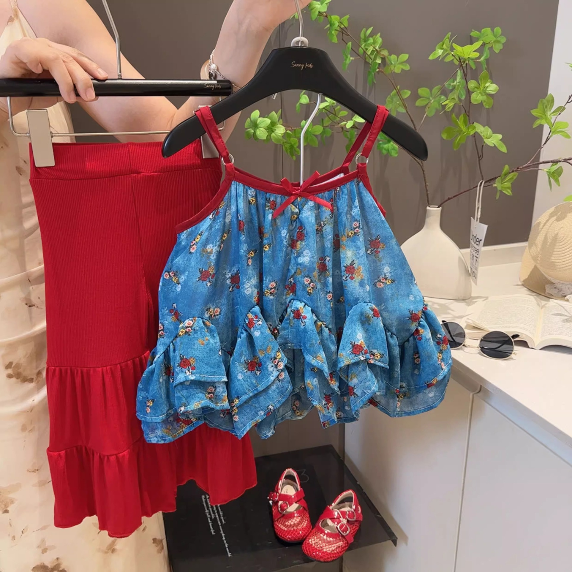 여름 한국 스타일 소녀 휴가 스타일 서스펜더 베이비 셔츠 여름 어린이 베이비 쉬폰 프릴 탑과 부츠컷 바지