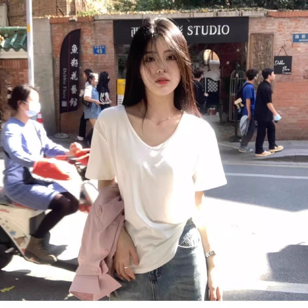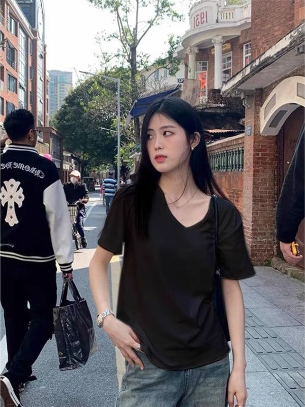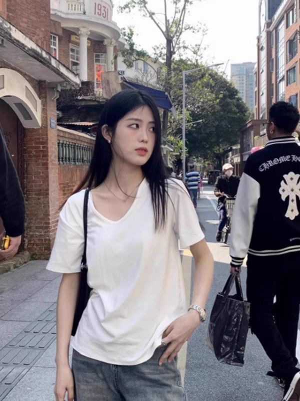 여름 여성용 순면 화이트 오른쪽 어깨 브이넥 반팔 티셔츠 루즈한 게으른 스타일 시크한 바닥 캐주얼 다용도 탑스토어 가기