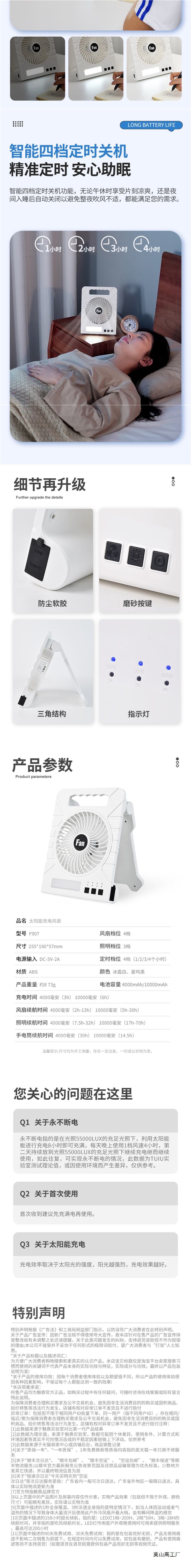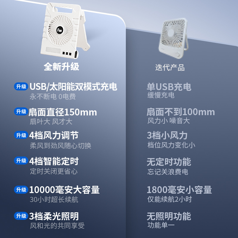 • [동료를 놀리는 8가지 장점] 태양광/USB 이중 충전 모드, 확대된 팬 표면, 탈부착 및 세척 가능, 4단계 풍력, 4단계 타이밍, 3단계 조명 손전등