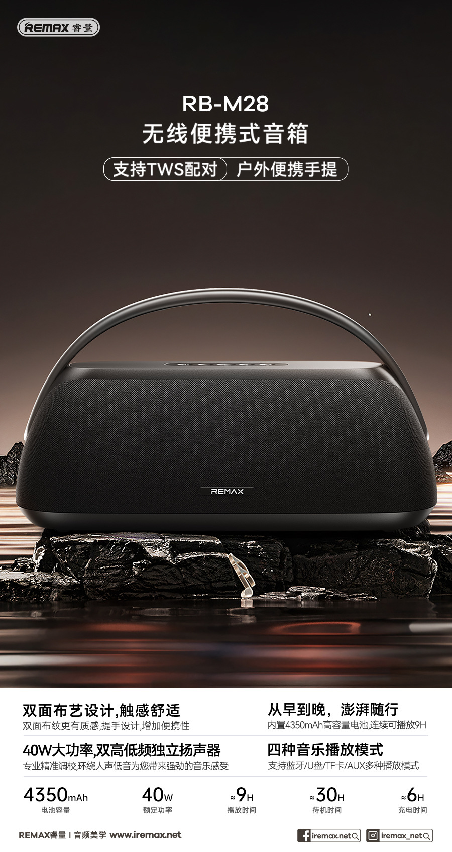 REMAX 무선 40W 휴대용 야외 데스크탑 휴대용 블루투스 스피커 듀얼 고주파 및 저주파 오디오 M28스토어 가기