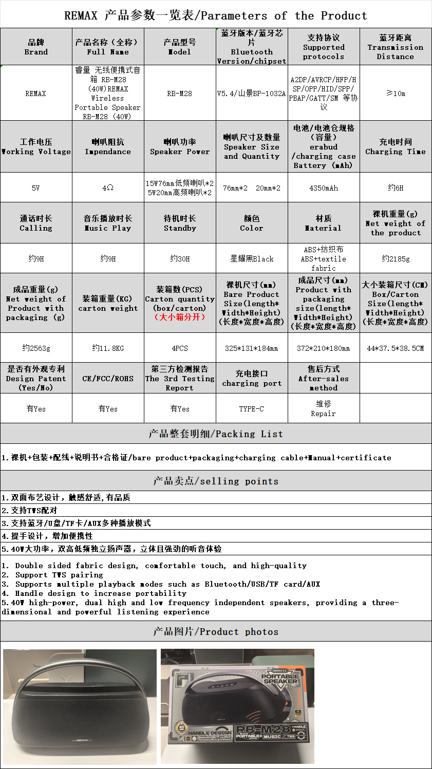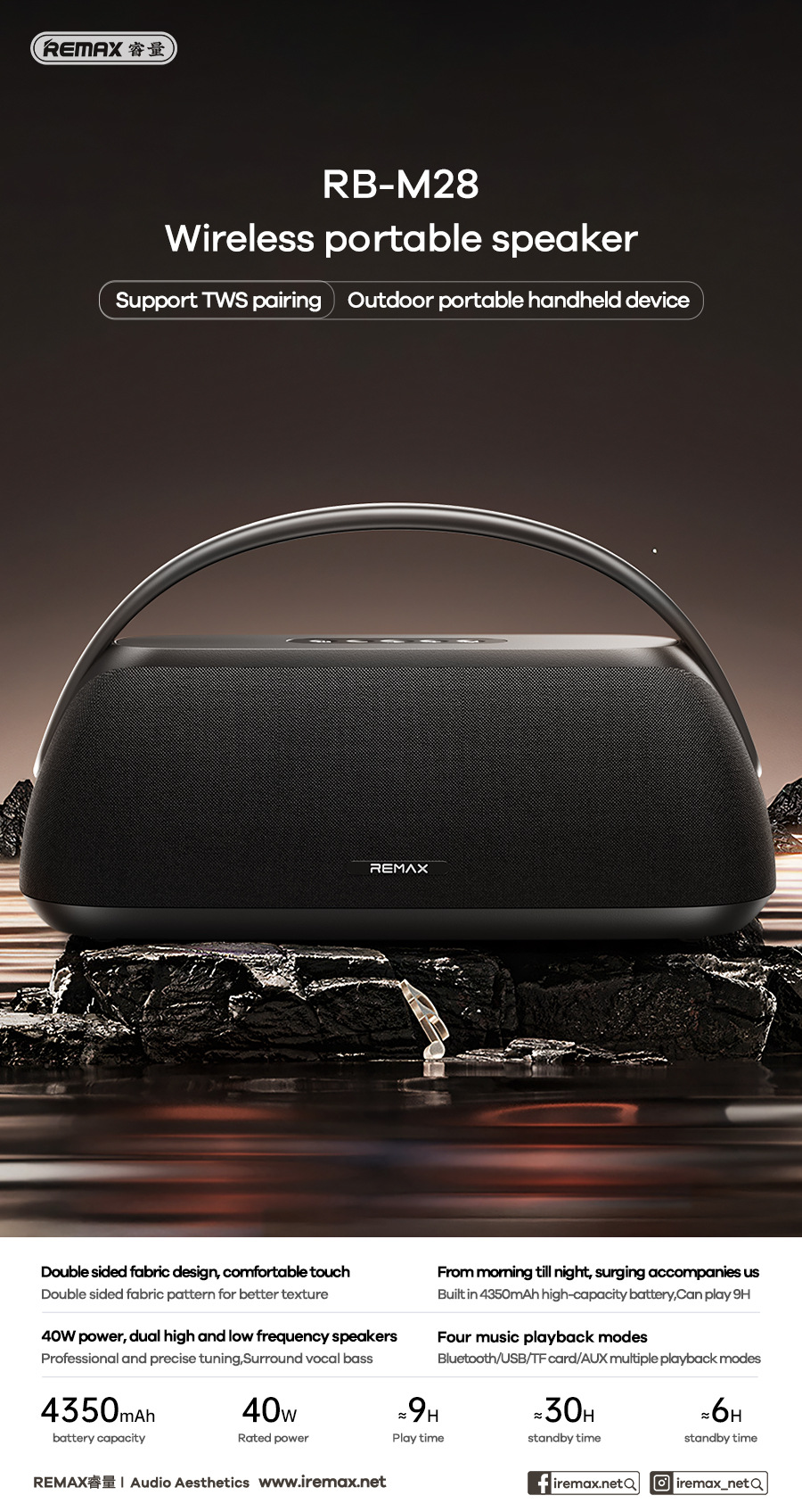 REMAX 무선 40W 휴대용 야외 데스크탑 휴대용 블루투스 스피커 듀얼 고주파 및 저주파 오디오 M28