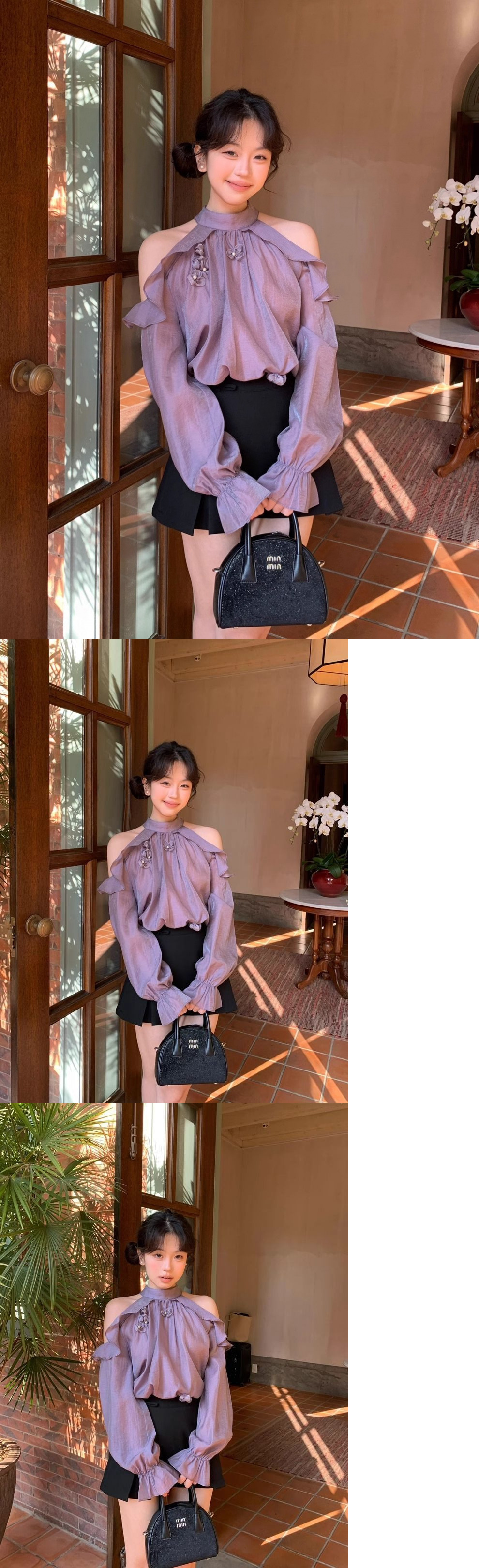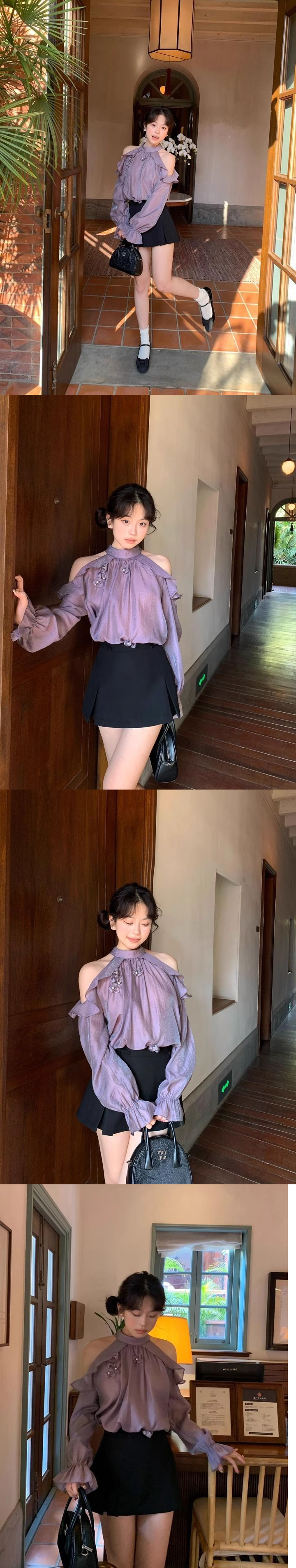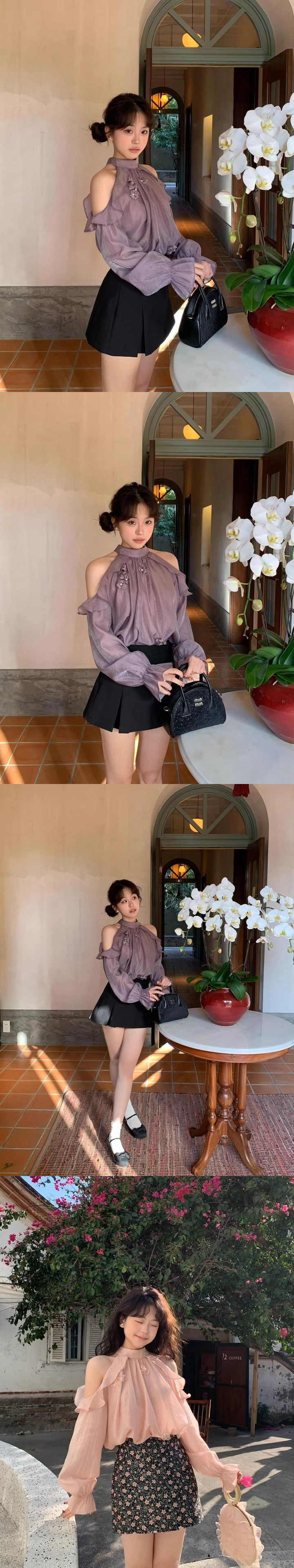 뉴 블랙베리잼 프렌치 스위트 러플 오프숄더 쉬폰 셔츠 입체 플라워 홀터넥 긴팔 탑