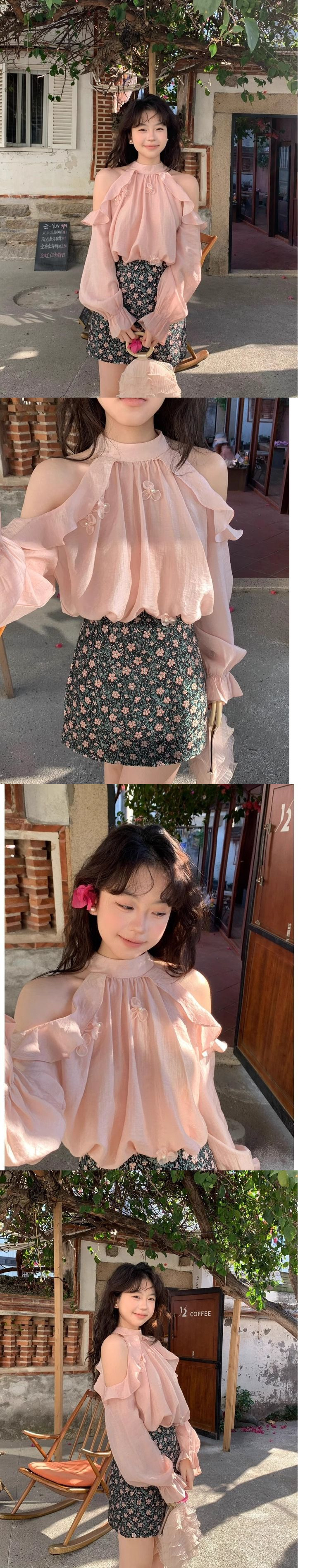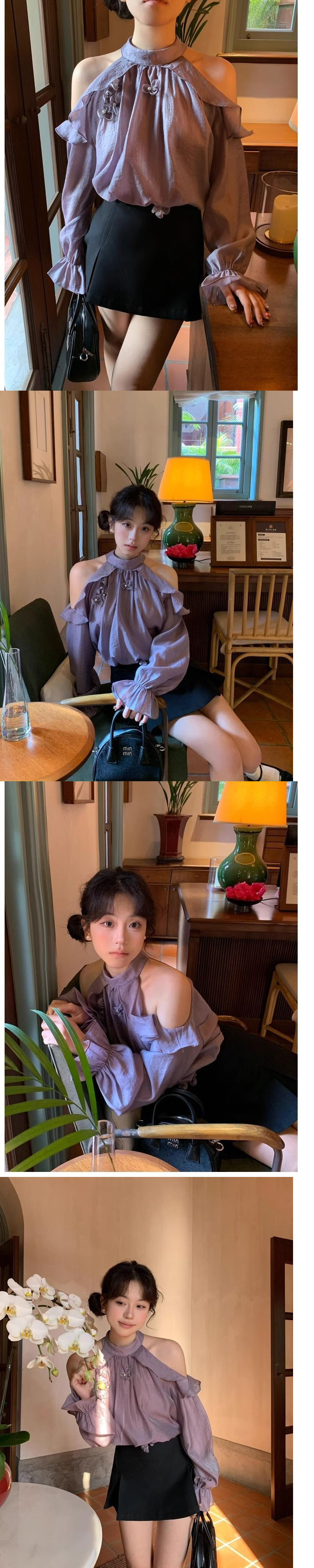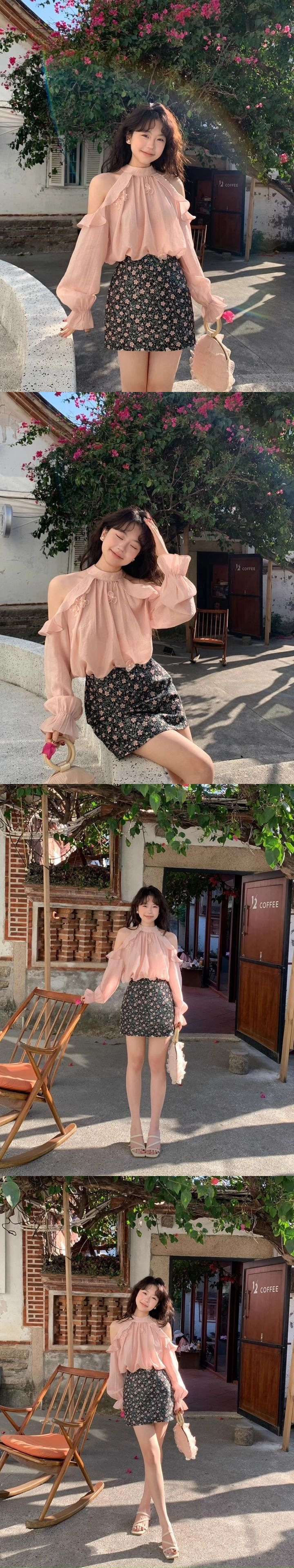 뉴 블랙베리잼 프렌치 스위트 러플 오프숄더 쉬폰 셔츠 입체 플라워 홀터넥 긴팔 탑