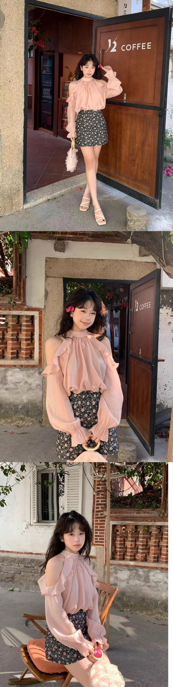 뉴 블랙베리잼 프렌치 스위트 러플 오프숄더 쉬폰 셔츠 입체 플라워 홀터넥 긴팔 탑스토어 가기