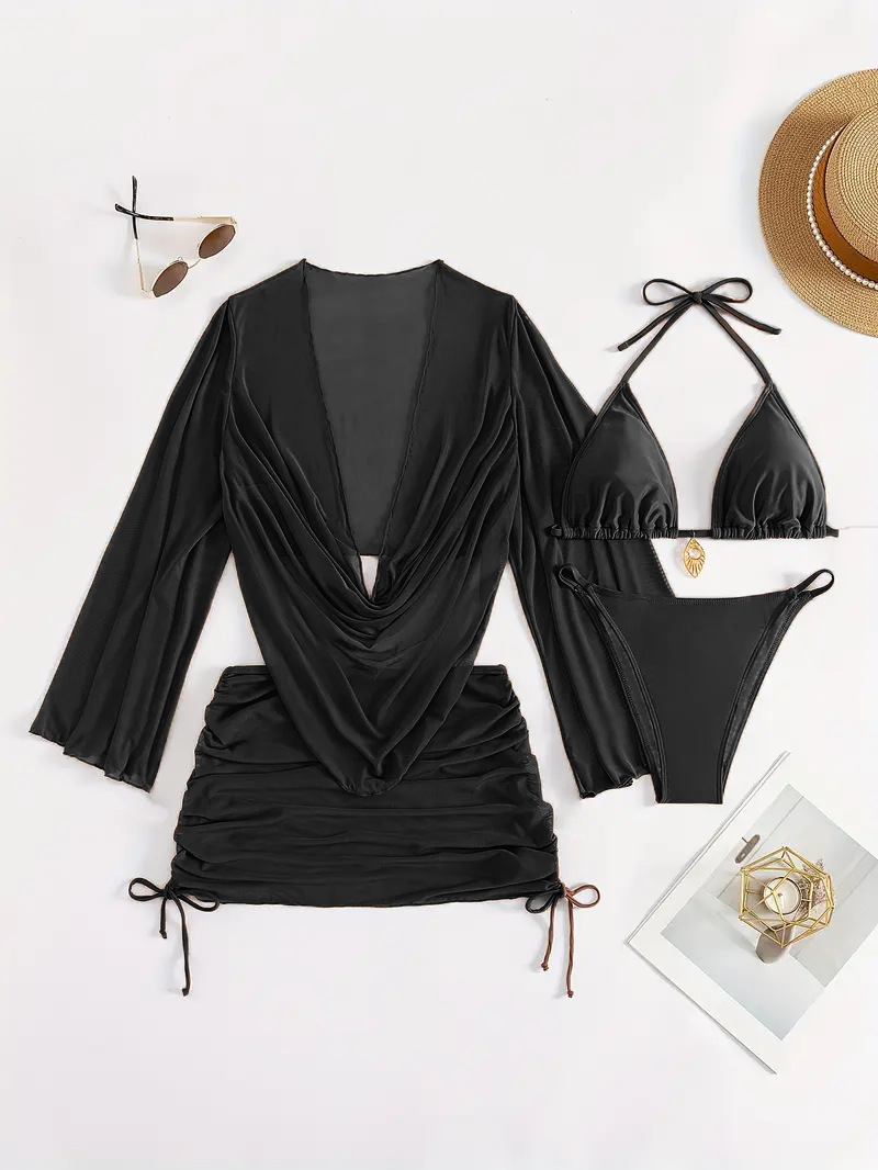유럽과 미국의 스플릿 수영복, 여성스러운 4피스 세트, 가벼운 거즈 블라우스, 레이스업 비키니, 여성용 크로스보더 새 수영복