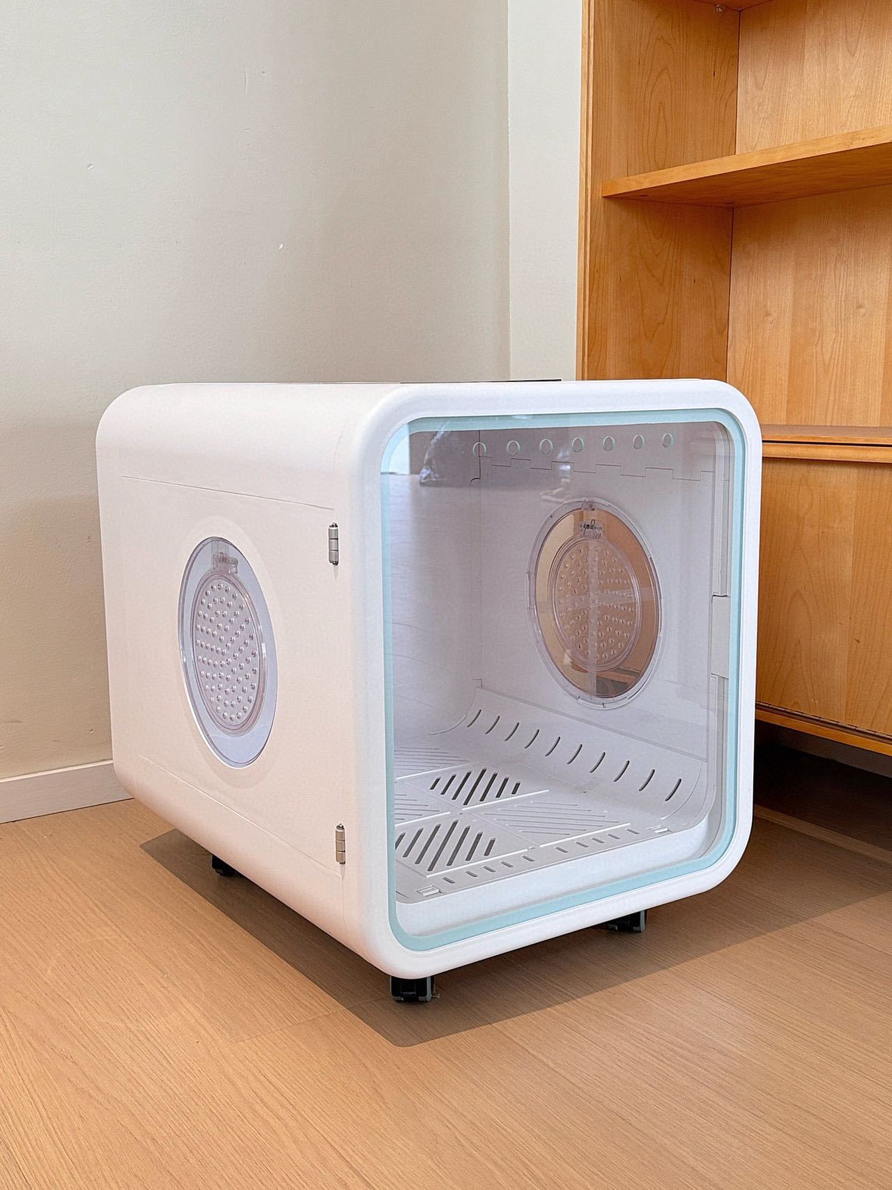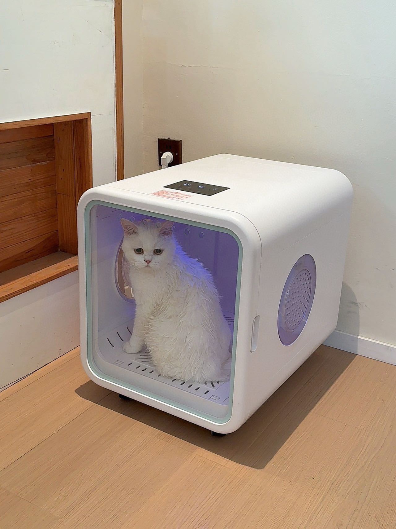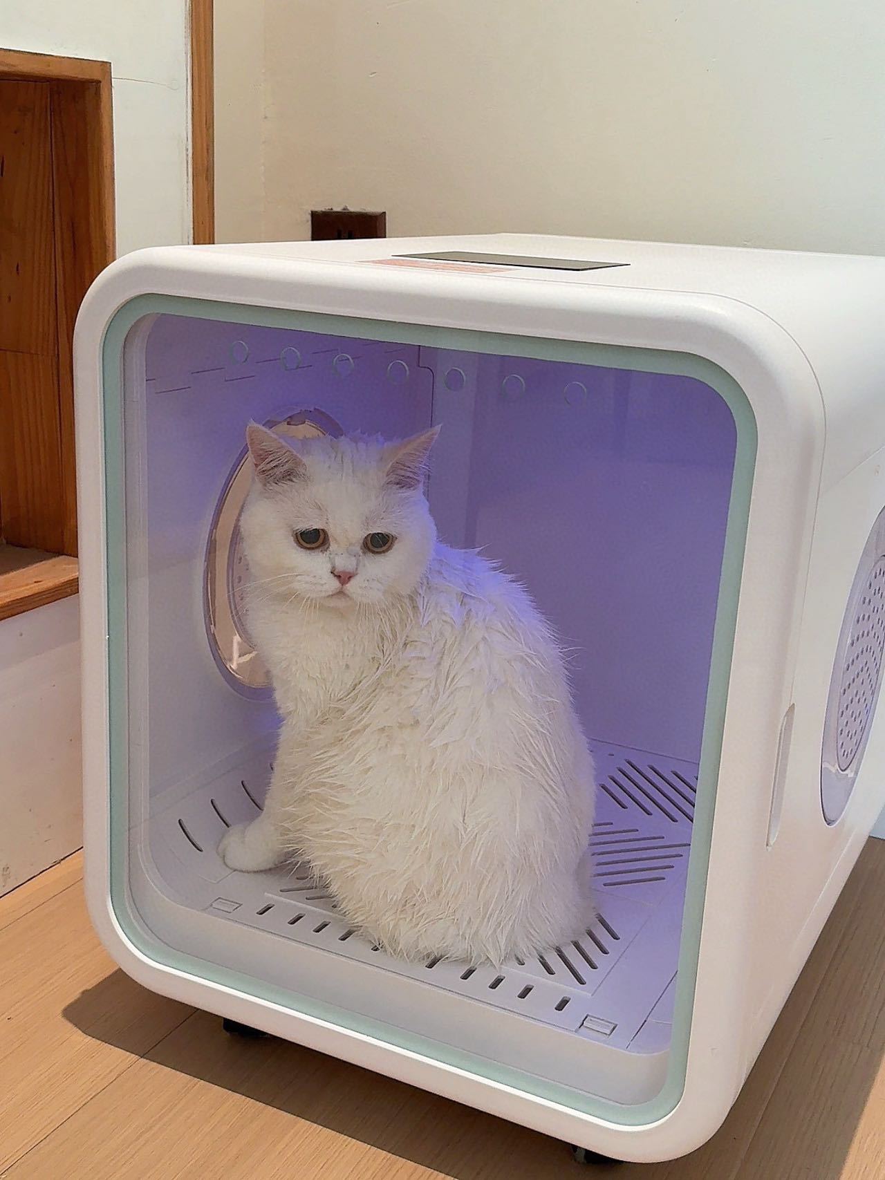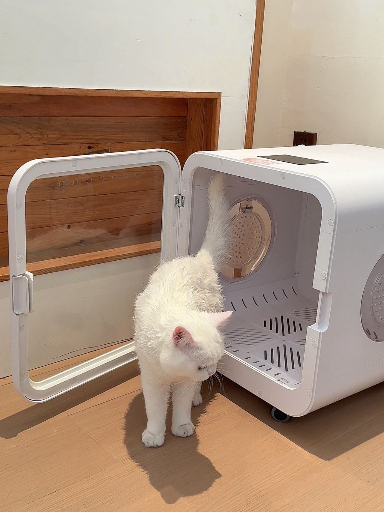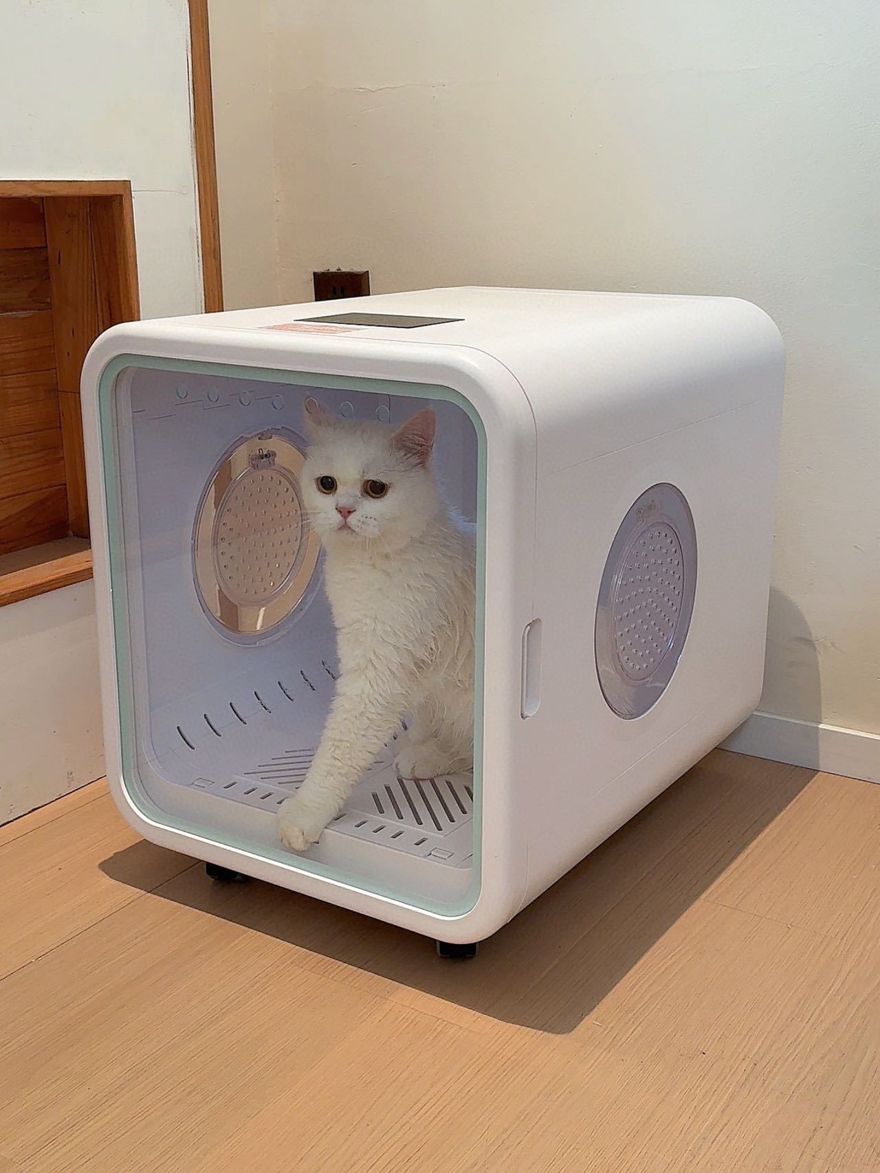 以前吹风机噪音吓到猫应激尿失禁… 这台运行超安静,逆子第一次进去居然没炸毛!透明舱能随时观察状态,还能伸手安抚,安全感爆棚