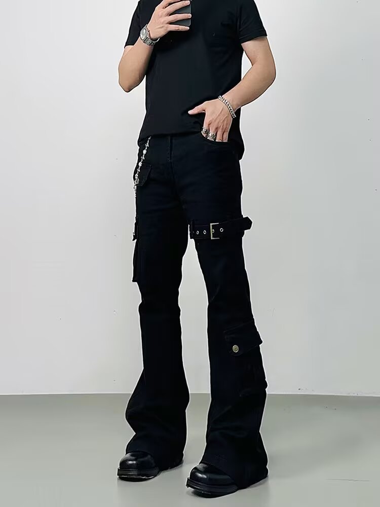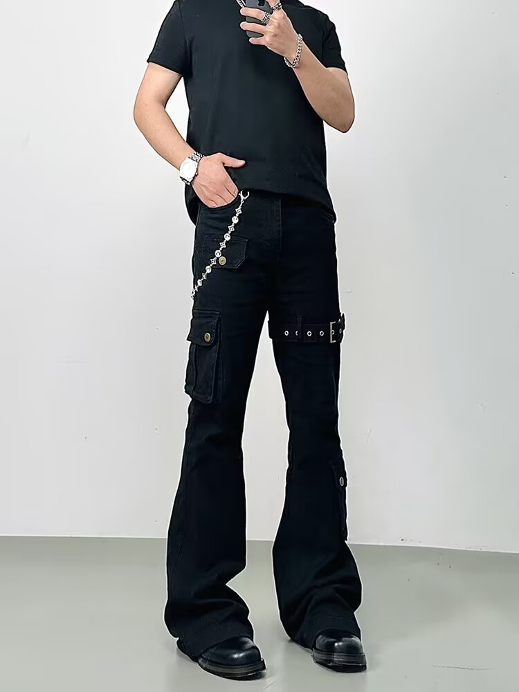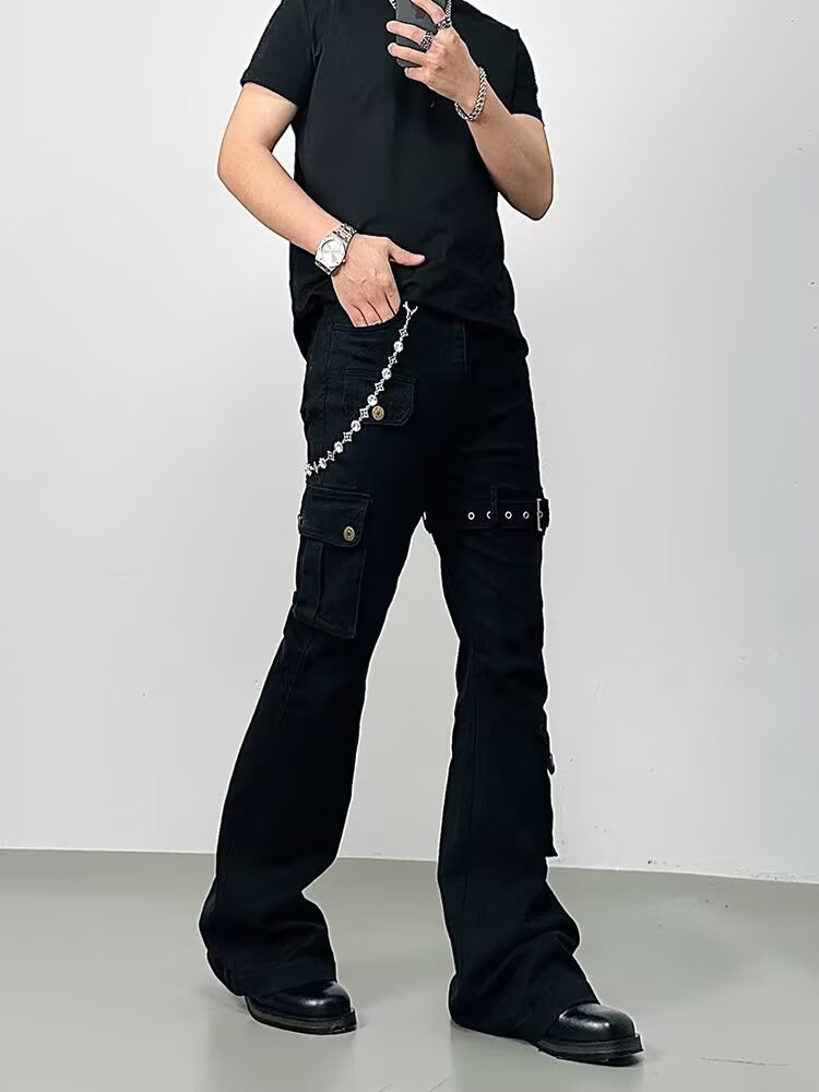 아메리칸 레트로 바이브 멀티 포켓 스트랩 마이크로 플레어 오버올 남성과 여성 틈새 디자인 루즈한 데님 바지 트렌디스토어 가기