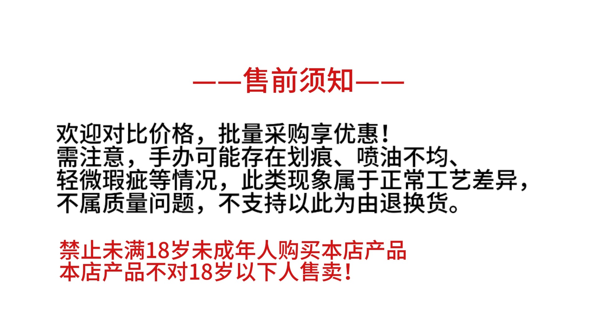 祖国版手办受工艺限制,无法做到零瑕疵 。像上色不均、染色、接缝明显、有气孔,可动系列手办关节松动这类情况,都可能出现,追求完美的小伙伴请谨慎下单~