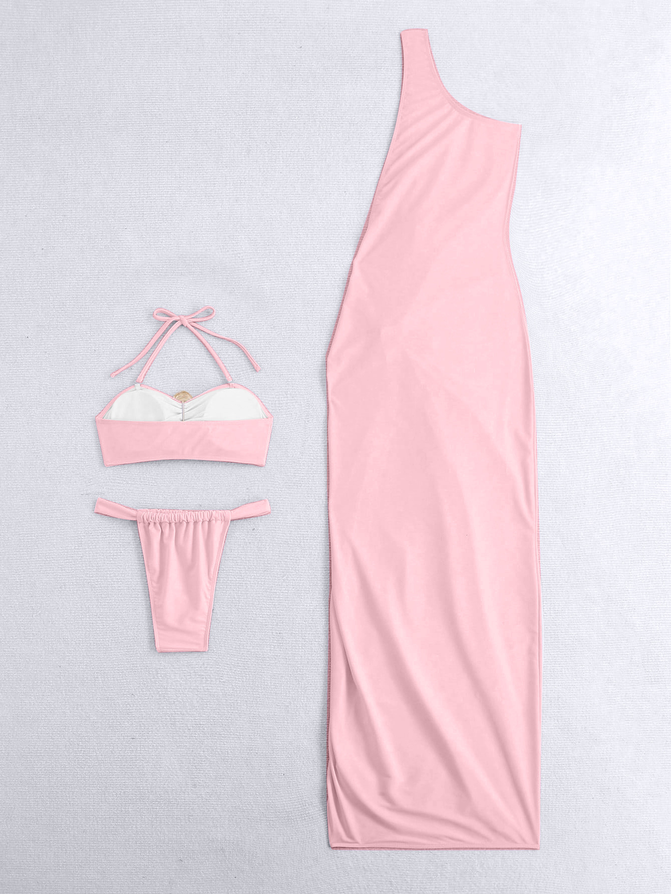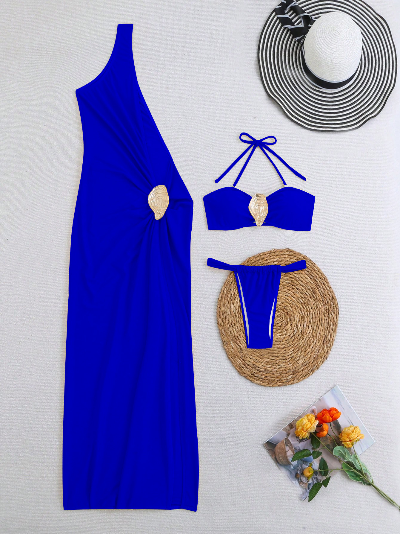유럽과 미국 스타일의 섹시한 단색 비키니, 메탈 장식이 있는 원피스 3피스 수영복, 슬림한 비치 드레스 수영복 여성용스토어 가기