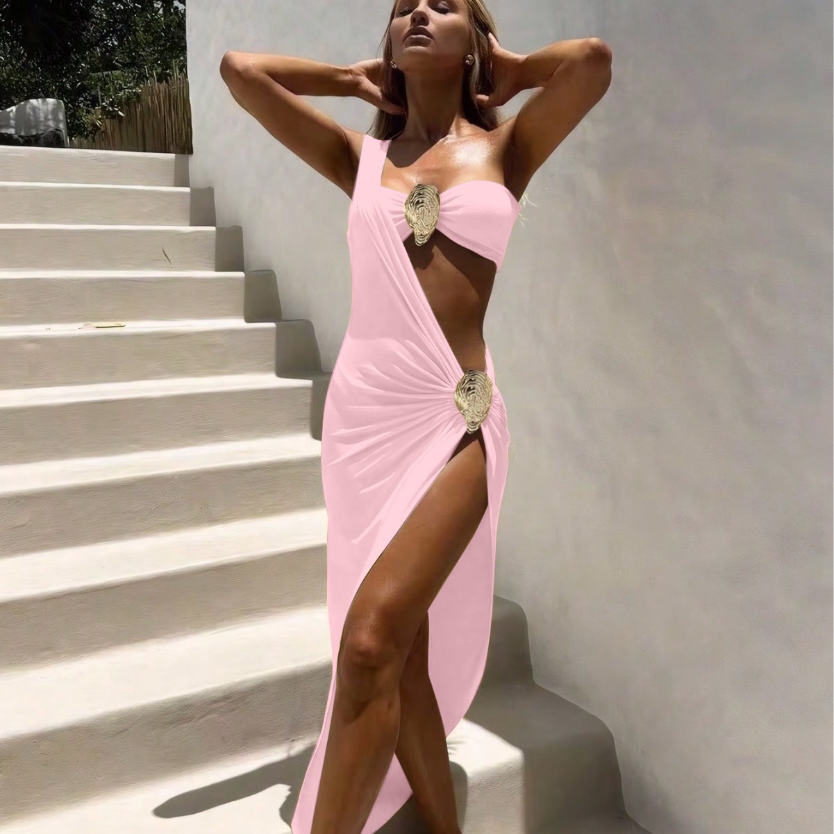 유럽과 미국 스타일의 섹시한 단색 비키니, 메탈 장식이 있는 원피스 3피스 수영복, 슬림한 비치 드레스 수영복 여성용