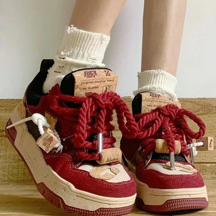 새로운 중국 스타일, 국가 스타일, 트렌디한 복고풍 캐주얼 틈새 시장, 생일 연도 빵 신발, 레드 와인 트랜스퍼 신발, 두꺼운 밑창 로우탑 스니커즈