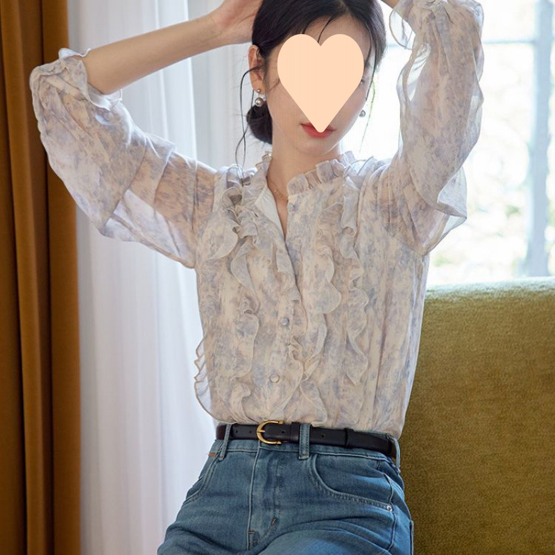 여성을위한 파란색과 보라색 나무 귓불 프린트 셔츠 2025 봄 프랑스 복고풍 긴팔 기질 디자인 탑 다용도