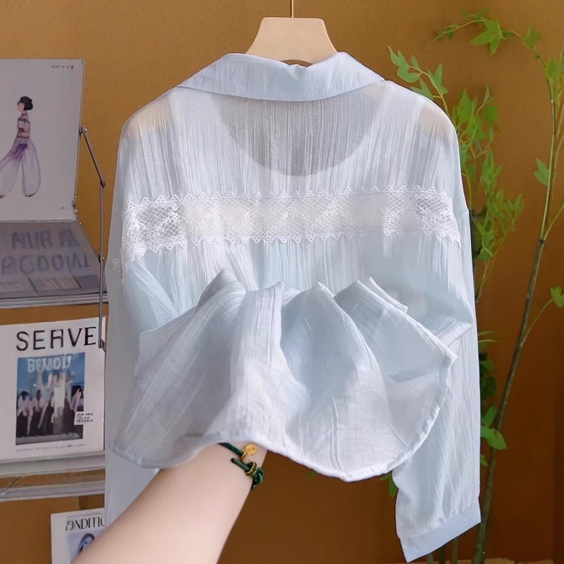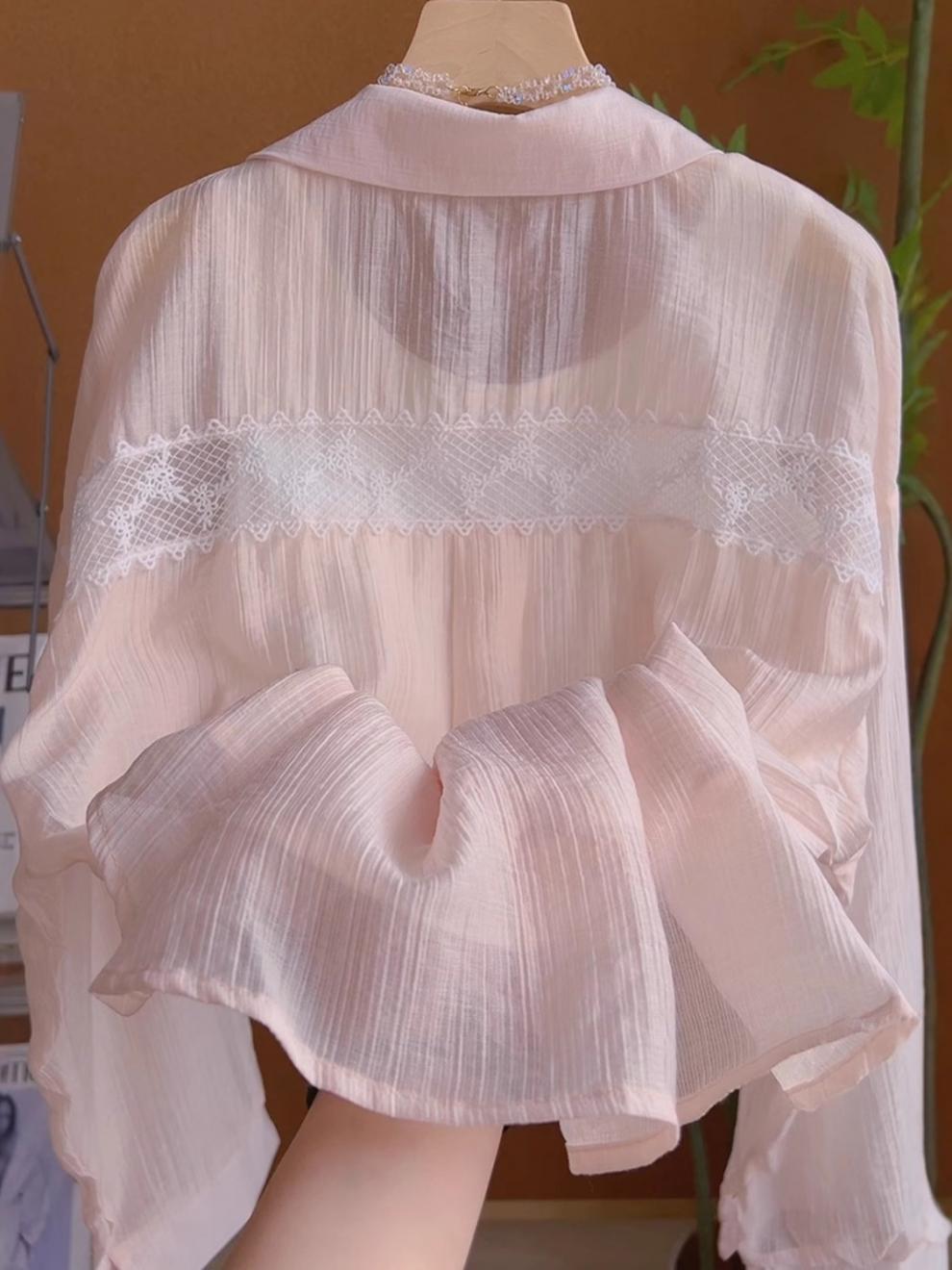 여성을위한 부드러운 핑크 얇은 자외선 차단제 셔츠 여름 레이스 스플 라이스 경량 통기성 카디건 셔츠 재킷