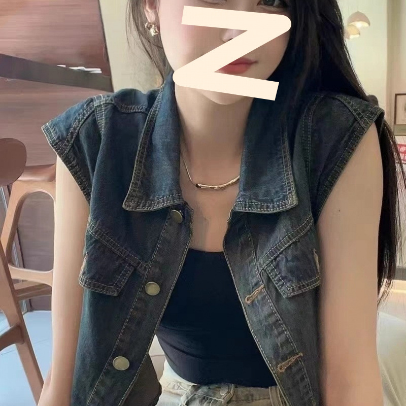 아메리칸 레트로 하이 엔드 기질 다재다능한 데님 조끼 여성 폴로 칼라 짧은 민소매 조끼 탑 카디건 여름