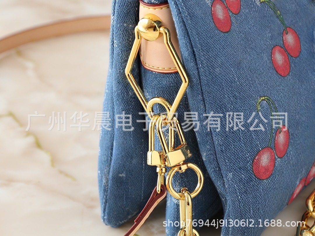 새로운 중고 가방 무라카미 류 시리즈 데님 블루 체리 마작 가방 노안 프린트 레트로 겨드랑이 체인 여성용 가방