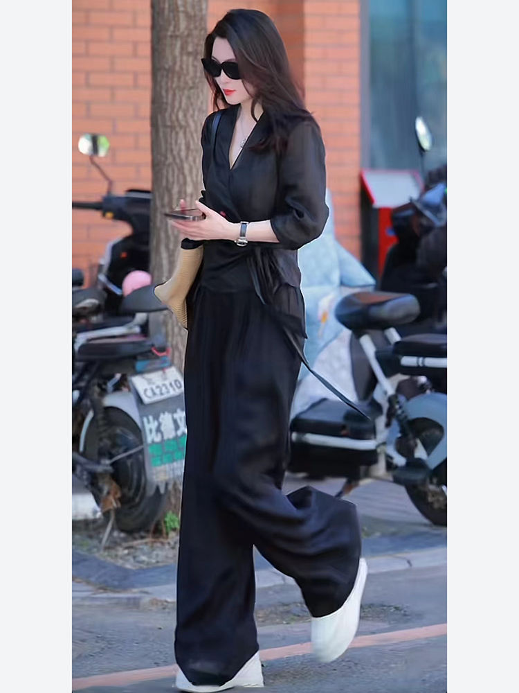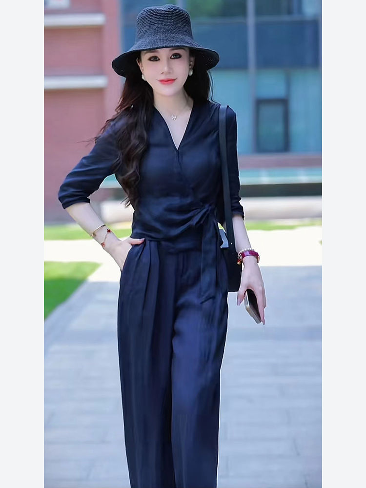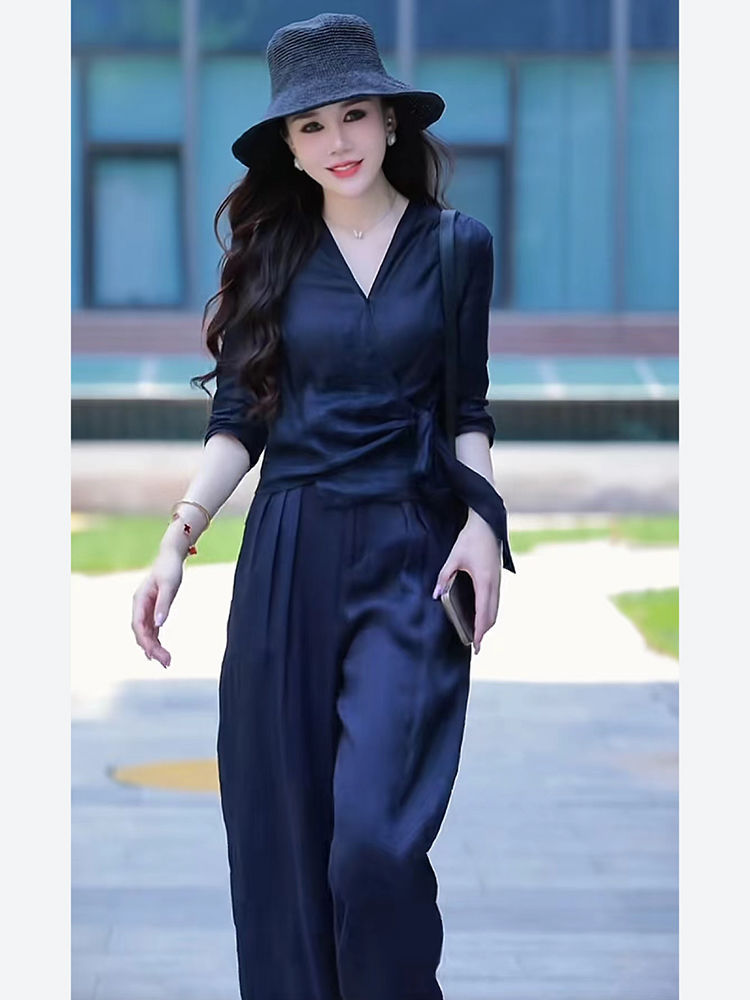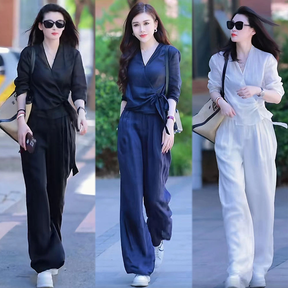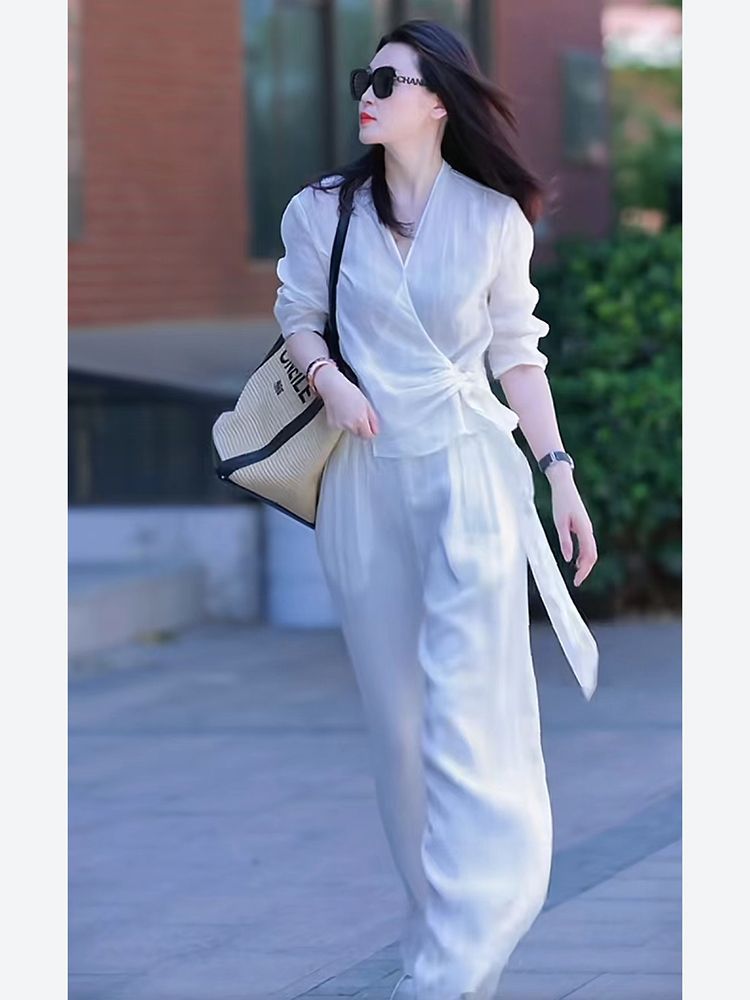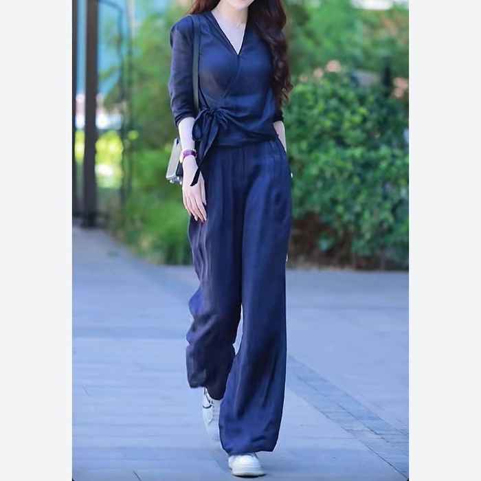 2025 여름 신작 여성 예술적이고 패셔너블한 연령 감소 디자인 브이넥 셔츠 다용도 하이웨이스트 와이드 팬츠 # 914