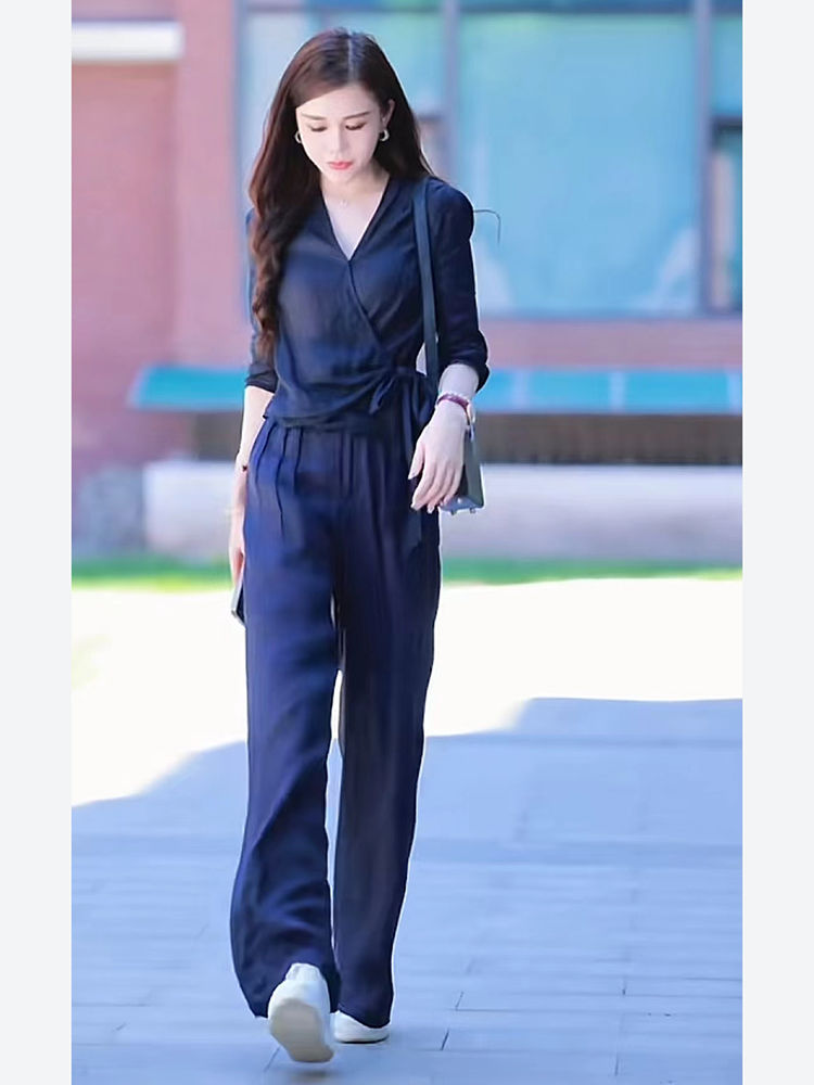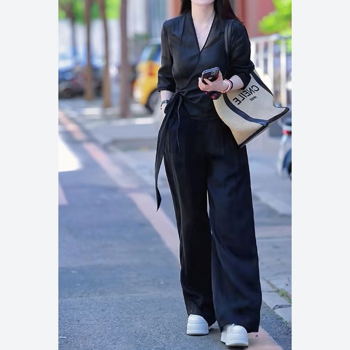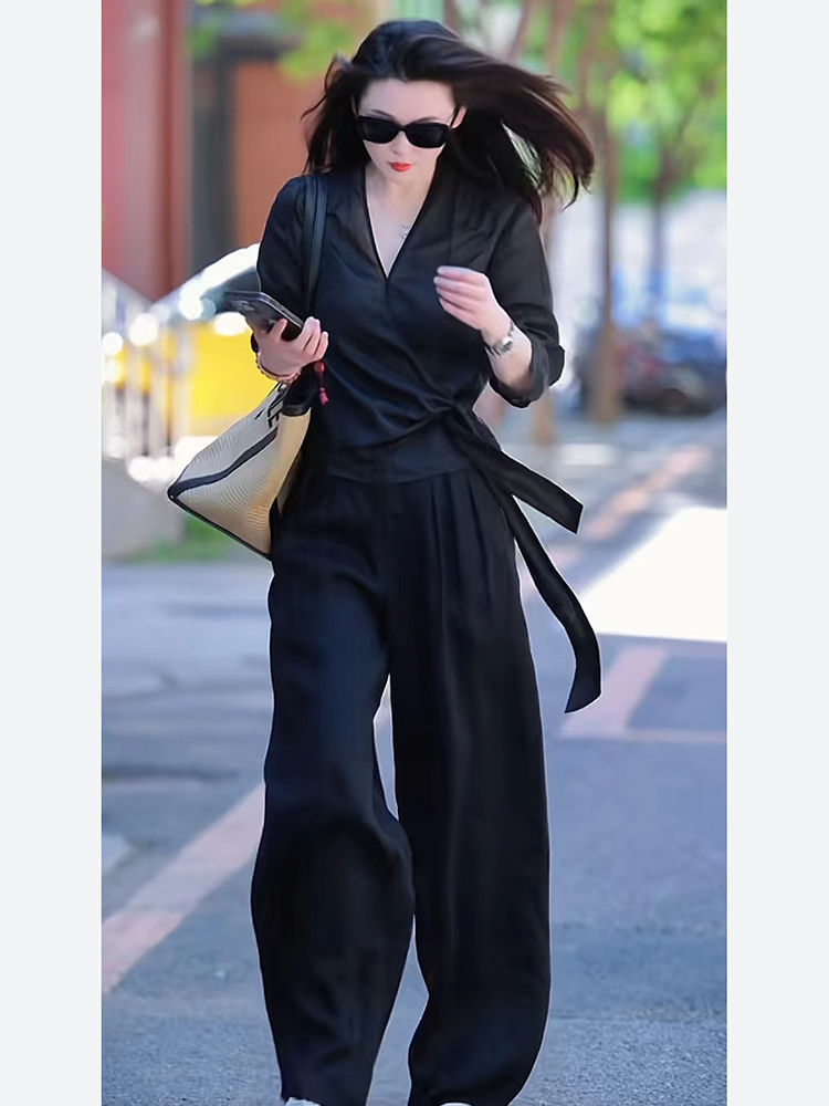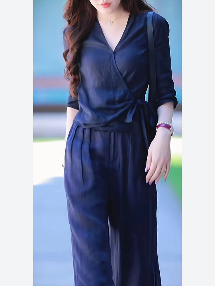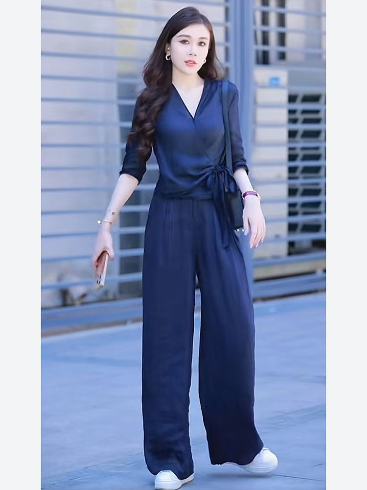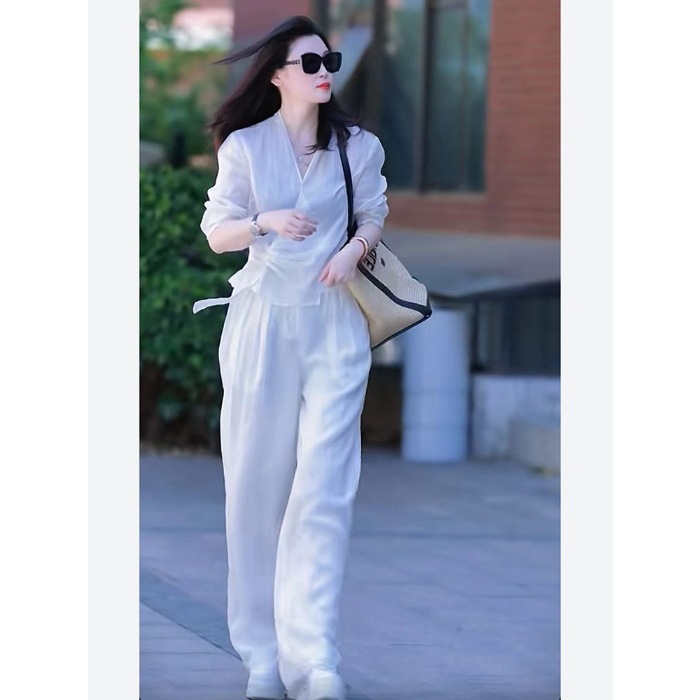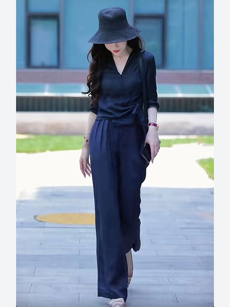 2025 여름 신작 여성 예술적이고 패셔너블한 연령 감소 디자인 브이넥 셔츠 다용도 하이웨이스트 와이드 팬츠 # 914